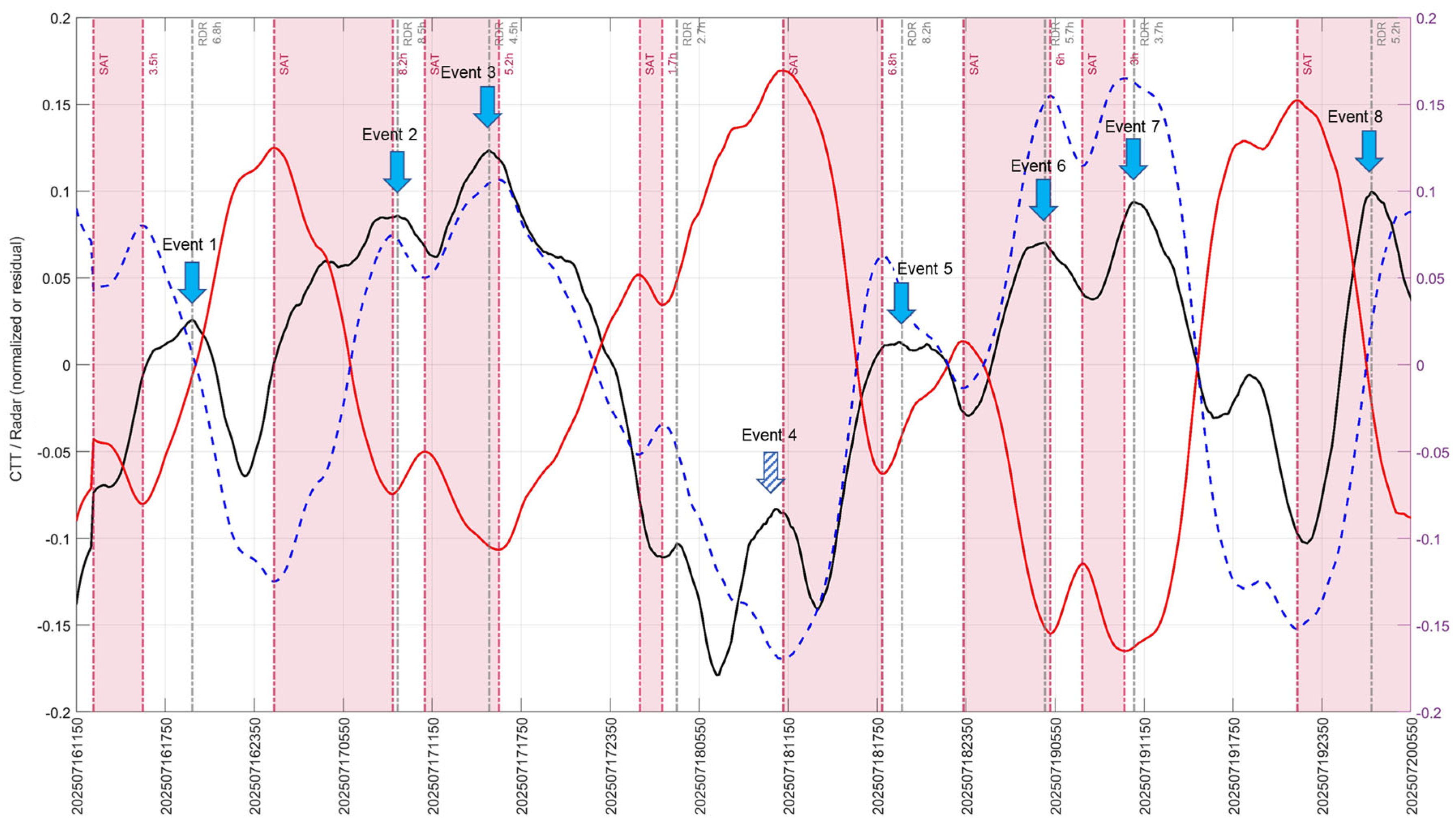 signals. In examining individual events, the undetected case (Event 4) corresponded to the weakest rainfall episode among the eight events analyzed. This episode exhibited limited convective development and did not produce a sufficiently pronounced CTT rise–peak–fall structure for the