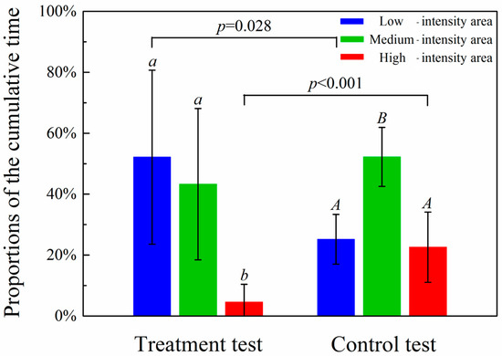 The proportions of the cumulative time fish spent in the high sound intensity areas in the experimental test were significantly less than that in the control test (p < 0.001), which indicated that the test fish showed negative phonotaxis to the generated sound. However, 4.6 ± 5.8% of test fish time was spent in the high sound intensity area, indicating that the effect is not as strong as the drive to escape from natural enemies.