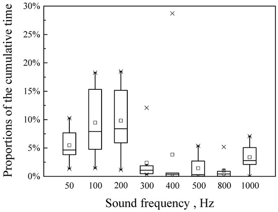 Figure 5 shows the proportions of the cumulative time that fish spent in the high sound intensity area for each frequency treatment group. The proportions in higher sound frequency conditions (300–1000 Hz) were significantly lower than the proportions in lower sound frequency conditions (50–200 Hz) (p < 0.001).