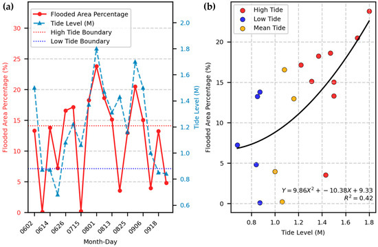 To ascertain that tidal water level remains the primary determinant of instantaneous fluctuations in inundation area, even after accounting for long-term average frequency, a comprehensive analysis was performed using 18 Sentinel-1 (S1) images acquired between June and September 2025. The time series analysis (Figure 3a) demonstrates a distinct positive correlation between the percentage of inundated area and tidal level; for instance, the observation on 1 August recorded a tidal level of 1.8 m alongside an inundation area approaching 25%. The relationship was modeled using a quadratic function, (Figure 3b) with an R2 value of 0.42. Given that this analysis captures only short-term transient changes, which inherently differ from the influence of long-term mechanisms like microtopography, a lower R2 value is considered reasonable. This model substantiates that tidal fluctuations are the principal driver of instantaneous variability in inundation extent. Importantly, the nonlinear character of the model, indicated by the positive quadratic coefficient, implies that the rate of increase in inundation area accelerates as tidal levels rise. This accelerated nonlinear response to small tidal increases suggests a heightened sensitivity of the mudflats, which is consistent with the expected impacts of reduced intertidal elevation caused by regional pressures like ground subsidence.