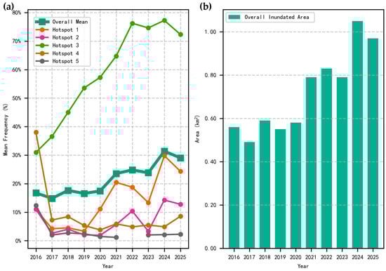 The comparison of mean inundation frequency annual variation (2016–2025). (a) the annual mean flood frequency. (b) the annual total inundated area.