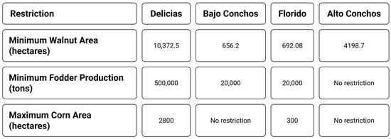 In the case of fodders, restrictions were established by analyzing yields and crop areas over multiple years, selecting historical minimums as limits. Details on how the cropping restrictions were established for each of the four selected irrigation districts are depicted in Figure 3.