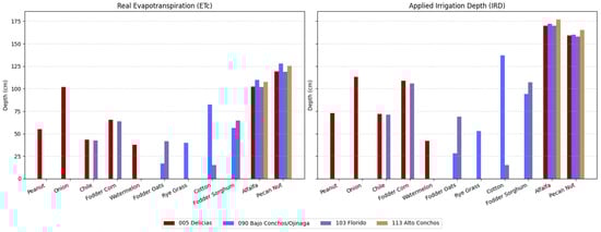 Using the previously mentioned FAO crop coefficient methodology () and its corresponding equations, along with the analyzed values, we calculated the crop evapotranspiration () for each crop by irrigation district. Each calculation was adapted to the specific requirements of the crops, which depend mainly on latitude. Once the initial was calculated for each irrigation district, and additional adjustments were made to align these values with the district-level water deliveries detailed in Section 2. This process enabled us to determine the net water demand (NWD), also known as the net irrigation depth, for each crop. Figure 5 presents the resulting comparison, showing both the calculated crop evapotranspiration () and the subsequent net water demand for each crop across all analyzed irrigation districts.