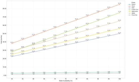 All crop yields show linear modification patterns. This is due to the linear adjustment proposed for the actual crop evapotranspiration. However, the linear behavior assumption used in this research, while facilitating multi-scenario analysis, has important implications for the results, including the potential underestimation of economic losses in crops, such as pecan nut, under extreme scarcity or the overestimation the relative benefit in fodder. Therefore, future work should focus on refining the modeling of vegetative cycles and the response to water stress using nonlinear models for a more accurate approximation. Despite this limitation, the current model arrangement provides an effective tool for decision makers to evaluate trade-offs and priorities under different levels of water availability.