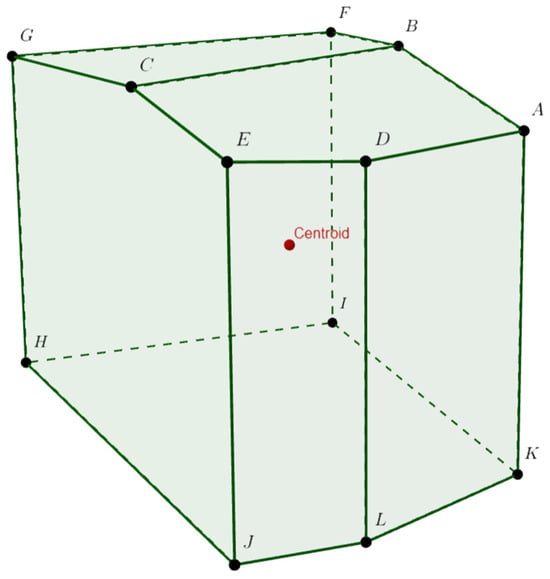 The polyhedron in 4 dimensions (projected to 3), that represents the solution set Cv for 90% availability. The set is delimited by the points A = (336.10, 16.72, 13.44, 42.50), B = (336.10, 16.72, 13.36, 42.58), C = (336.06, 16.76, 13.36, 42.58), D = (336.08, 16.75, 13.44, 42.50), E = (336.06, 16.76, 13.42, 42.51), F = (336.15, 16.72, 13.31, 42.58), G = (336.15, 16.76, 13.27, 42.58), H = (336.59, 16.76, 13.27, 42.13), I = (336.59, 16.72, 13.31, 42.13), J = (336.59, 16.76, 13.42, 41.98), K = (336.59, 16.75, 13.44, 41.98) and L = (336.59, 16.72, 13.44, 42.01), where each point (Del, BC, Flor, AC) is the amount in million USD given by each district. The solution Del = $336.3, BC = $16.74, Flor = $13.37, AC = $42.34 given in million USD (depicted in red) is the centroid of the polyhedron.