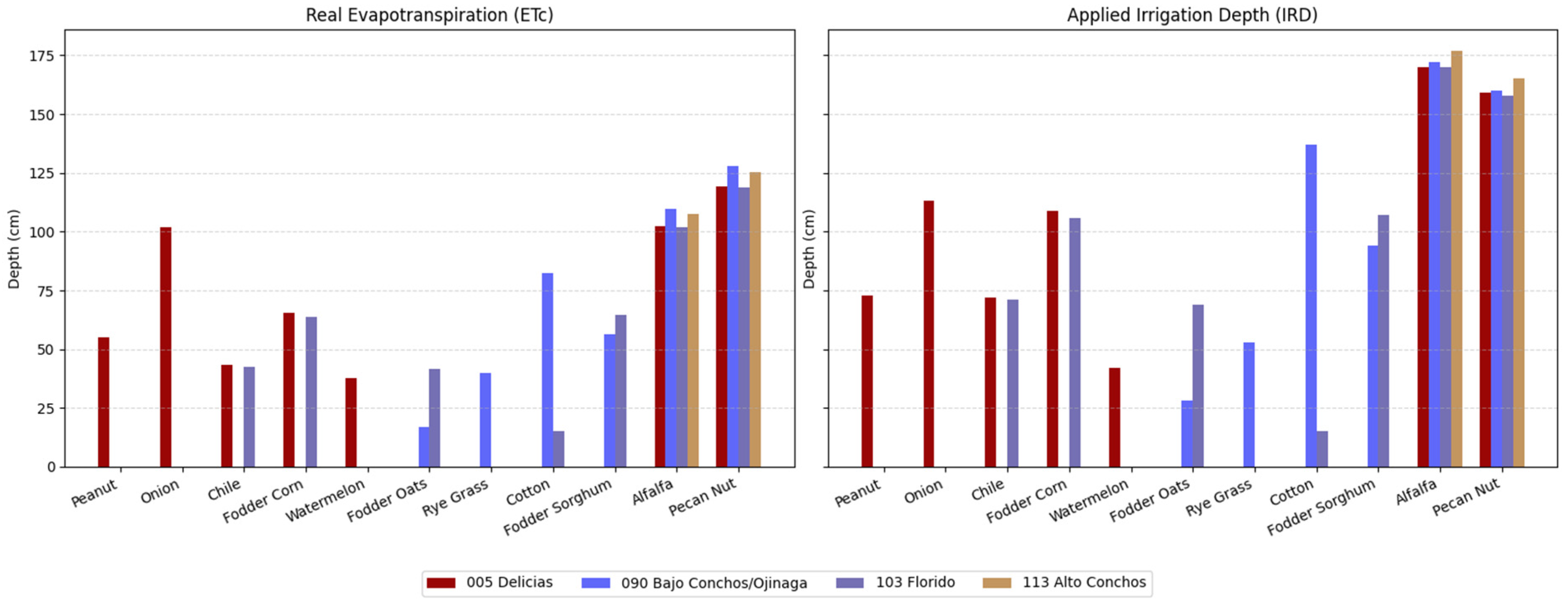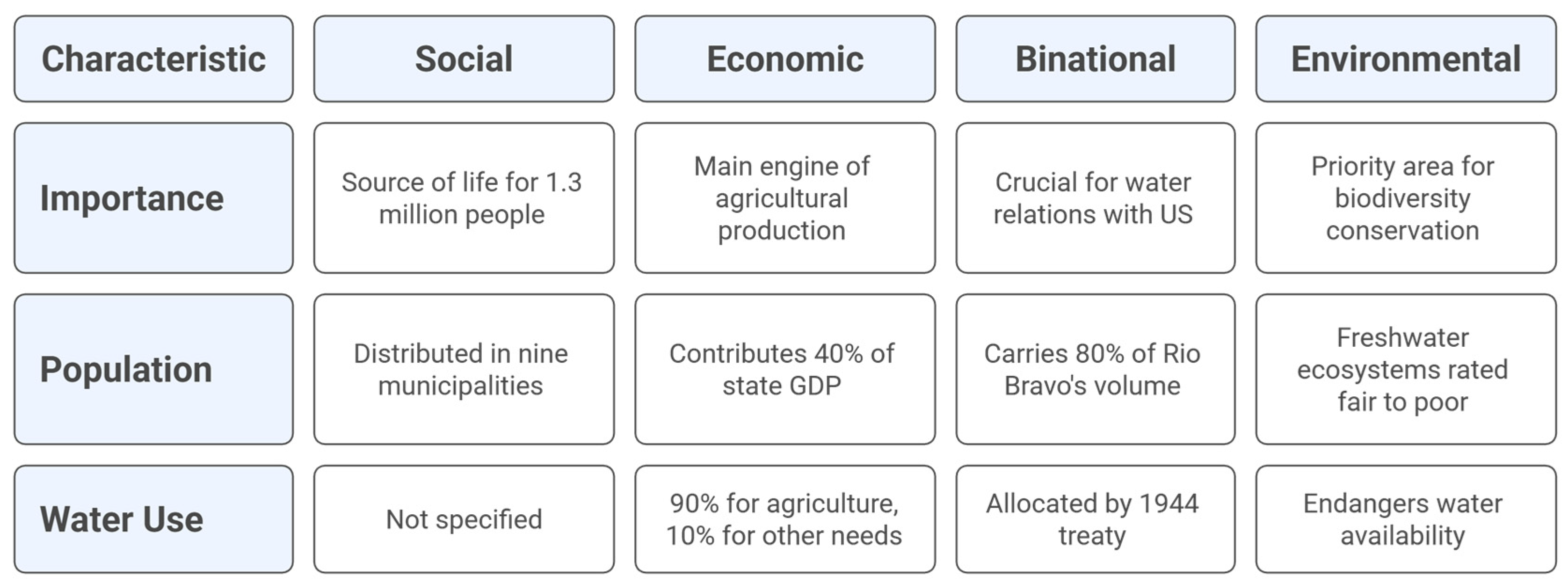 - Economically, the Conchos River is a key agricultural engine for the region. Its four main irrigation districts (005 Delicias, 090 Ojinaga, 103 Florido and 113 Alto Conchos) contribute approximately 40% of the state’s Gross Domestic Product (GDP) [10]. Moreover, about 90% of its surface water is used for agriculture, while the remaining 10% covers public-urban, industrial, livestock, and electricity generation need [18].