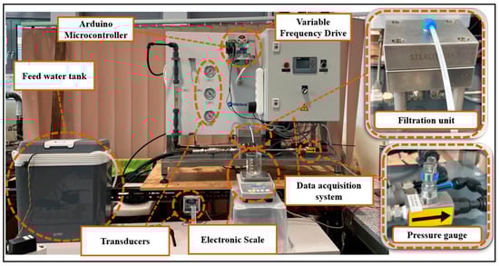 These sensors and transducers were connected to a data acquisition and control system LOGO! with LOGO! TDE interface, (Siemens AG, Munich, Germany), which monitored, displayed, and recorded all relevant operational parameters of the filtration system. The overall RO filtration unit and its associated instrumentation are illustrated in Figure 2.