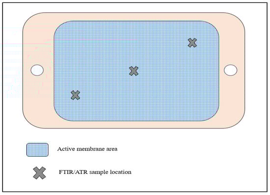 FTIR/ATR analysis was conducted as part of the membrane autopsy to evaluate changes in the hydration state and apparent sampling of the polyamide selective layer and to screen for potential chemical modification (i.e., carbonyl formation near ~1730 cm−1), as well as for general surface deposition (such as inorganic scaling) following the completion of the experimental procedure. For each flat sheet RO membrane, three spectral measurements were collected from predefined and consistent locations to ensure comparability across operating scenarios. Specifically, samples were taken from the center, left, and right regions of the feed side of each membrane coupon (as depicted in Figure 4), in order to representatively capture potential spatial variability in surface chemistry.
