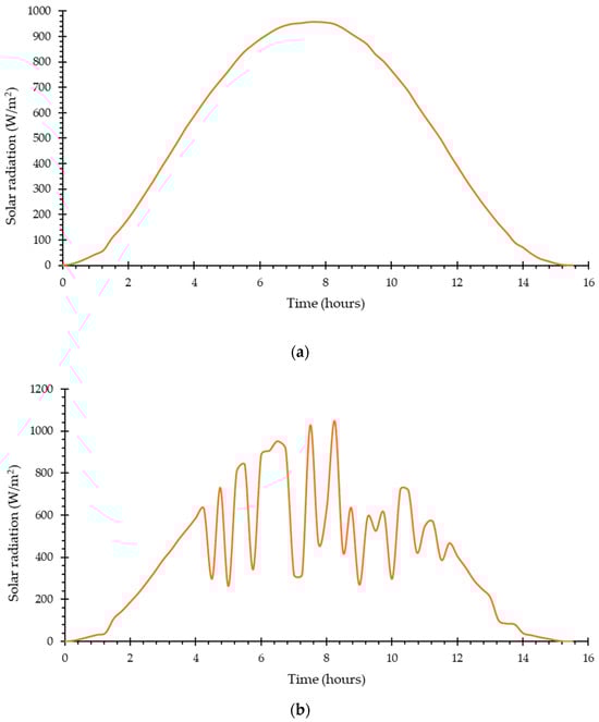 Solar irradiance data recorded by a PV monitor station on: (a) 27 July 2024 (sunny day); (b) 28 July 2024 (cloudy day).