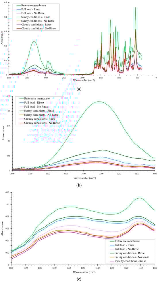 In addition, a new, pre-conditioned (virgin) flat sheet membrane was analyzed and used as a reference spectrum to distinguish operationally induced spectral changes from the native polymeric structure. All spectra were acquired over 400–4000 cm−1 with particular attention to the ~3300 cm−1 (O–H/N–H hydrogen-bonded stretching) and ~1650 cm−1 (amide I) regions. Given that the feed water was dechlorinated tap water spiked with NaCl, FTIR/ATR was used to assess compaction and general deposition rather than to speciate foulants, Complementary techniques would be required for definitive foulant identification.