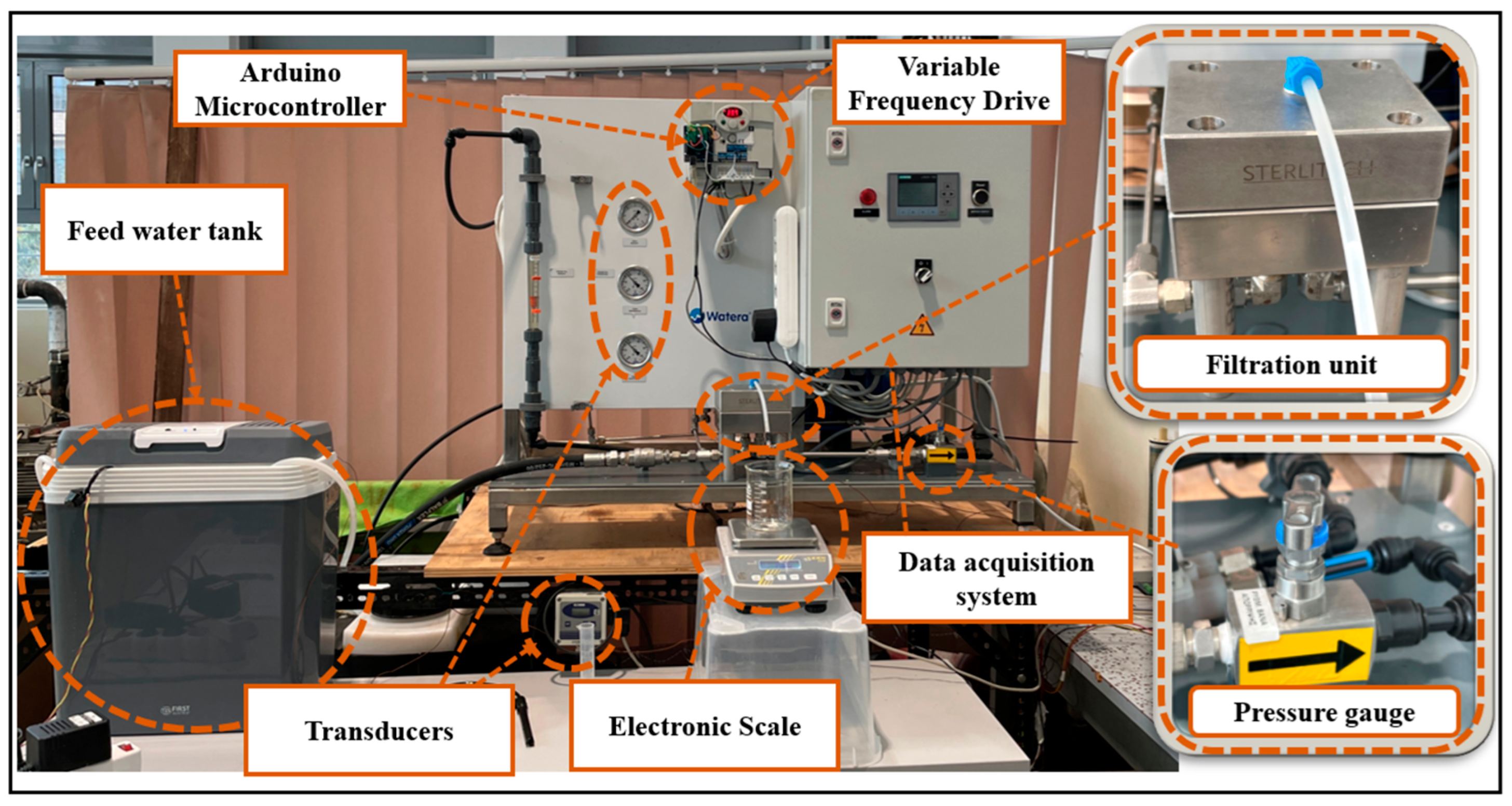 - Dimitriou, E.; Camacho-Espino, J.; Anastasiou, A.; Papadakis, G. Experimental Investigation of the Performance of a Seawater Reverse Osmosis Desalination System Operating under Variable Feed Flowrate Pressure and Temperature Conditions. J. Environ. Chem. Eng. 2025, 13, 115778. [Google Scholar] [CrossRef]