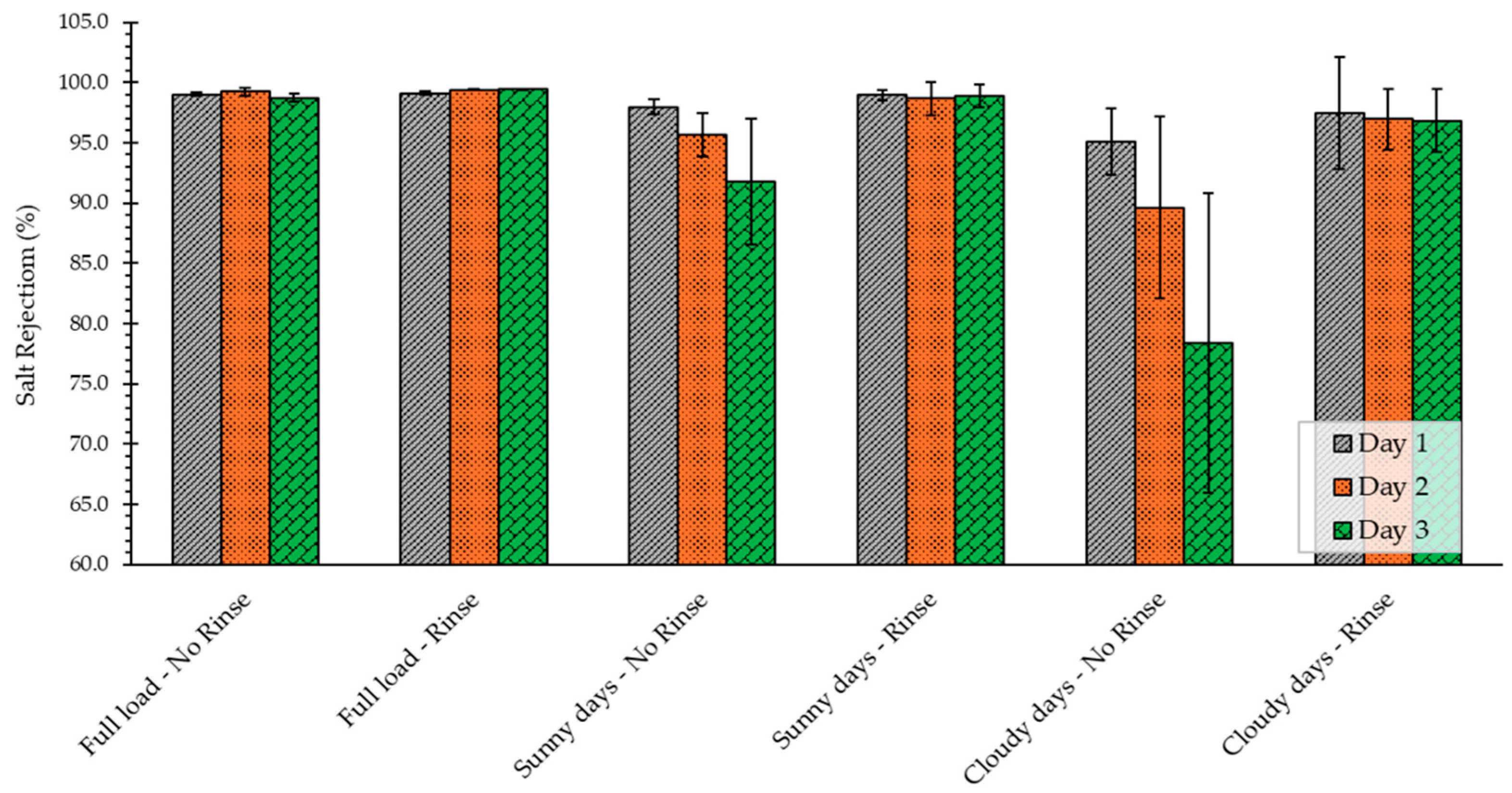 - Sarker, N.R.; Cherukupally, P.; Sodhi, R.; Bilton, A. End-of-the-Day Rinsing for Improved Maintainability of Intermittently Operated Small-Scale Photovoltaic-Powered Reverse Osmosis Systems. Desalination 2025, 599, 118439. [Google Scholar] [CrossRef]