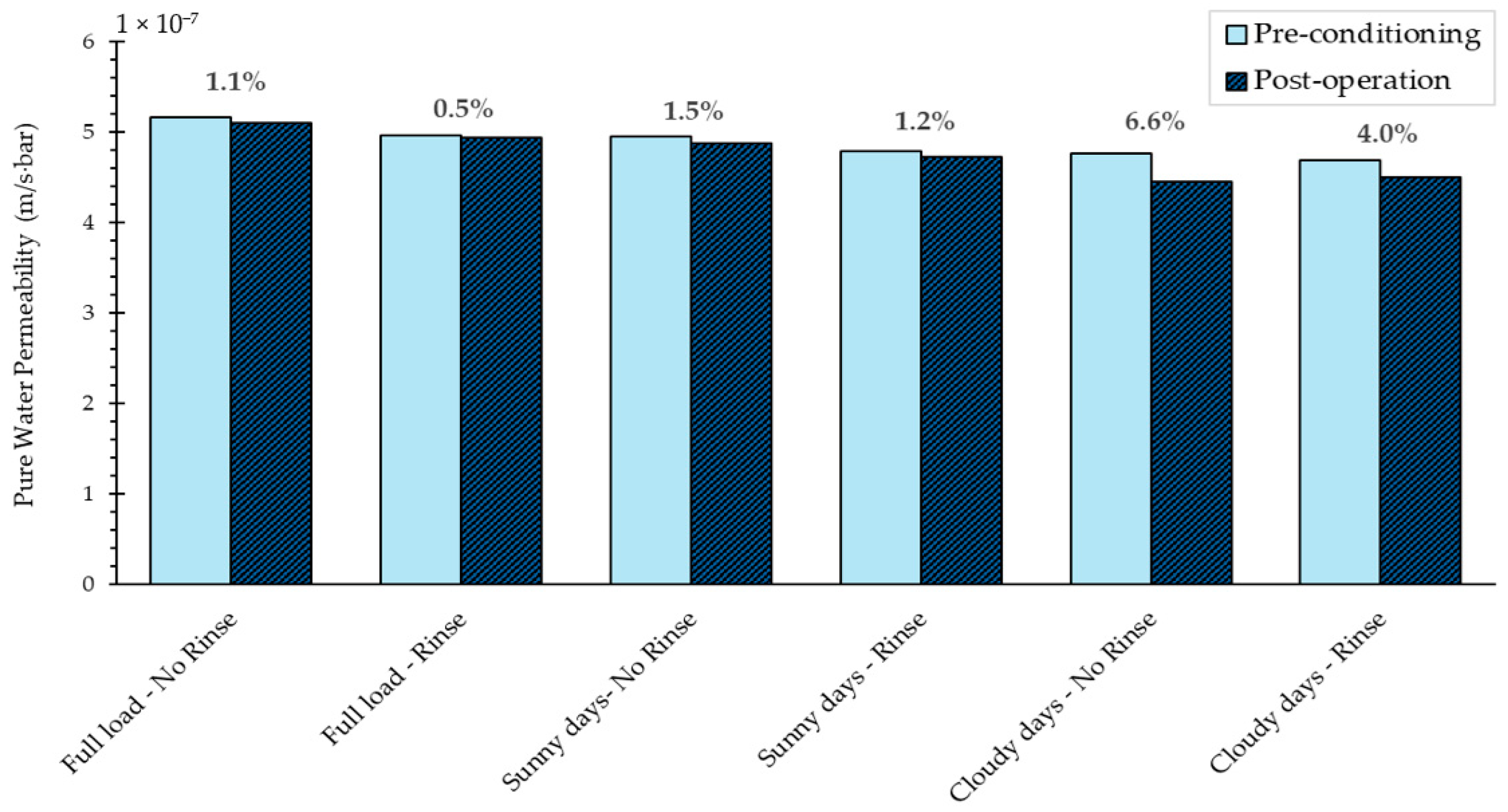 - Freire-Gormaly, M.; Bilton, A.M. Experimental Quantification of the Effect of Intermittent Operation on Membrane Performance of Solar Powered Reverse Osmosis Desalination Systems. Desalination 2018, 435, 188–197. [Google Scholar] [CrossRef]