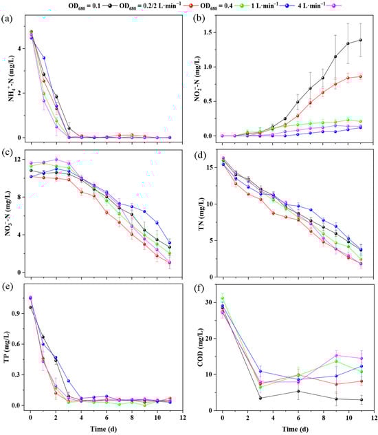 Variations in inorganic nitrogen, TN, TP and COD concentrations in the algae–bacteria symbiotic photobioreactor system under different initial inoculation densities and aeration rates. (a) Variations in NH4+–N concentration; (b) variations in NO2−–N concentration; (c) variations in NO3−–N concentration; (d) variations in TN concentration; (e) variations in TP concentration; (f) variations in COD concentration. “Time (d)” denotes the duration of reactor operation in days. The red line corresponds to the treatment with an initial inoculum density of OD680 = 0.2 and an aeration rate of 2 L min−1.