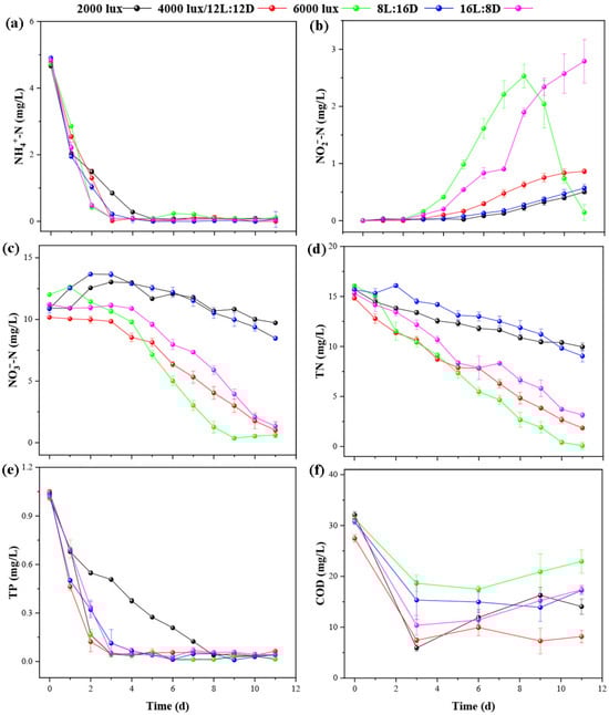 Variations in inorganic nitrogen, TN, TP and COD concentrations in the algae–bacteria symbiotic photobioreactor system under different light intensities and photoperiods. (a) Variations in NH4+–N concentration; (b) variations in NO2−–N concentration; (c) variations in NO3−–N concentration; (d) variations in TN concentration; (e) variations in TP concentration; (f) variations in COD concentration. “Time (d)” denotes the reactor operation period in days. The red line corresponds to the treatment condition with a light intensity of 68 μmol m−2 s−1 and a photoperiod of 12L:12D.