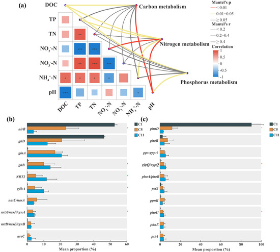 Mantel tests confirmed significant correlations between functional pathways and environmental variables (Figure 8a). Nitrogen metabolism correlated positively with pH (r = 0.527, p = 0.004), NH4+–N (r = 0.493, p = 0.024), NO2−–N (r = 0.573, p = 0.002), TP (r = 0.456, p = 0.026), and DOC (r = 0.651, p = 0.011), highlighting the importance of carbon availability and alkalinity in promoting nitrification–assimilation coupling. Phosphorus and carbon metabolism were also significantly correlated with pH (r = 0.537, p = 0.015; r = 0.541, p = 0.008) and DOC (r = 0.504, p = 0.018; r = 0.466, p = 0.024), suggesting that pH and organic carbon availability in the photobioreactor can enhance microbial P and C metabolism by regulating microbial activity. These results highlight the critical role of pH and nutrient availability (NH4+–N, DOC) in shaping microbial C–N–P metabolic processes.