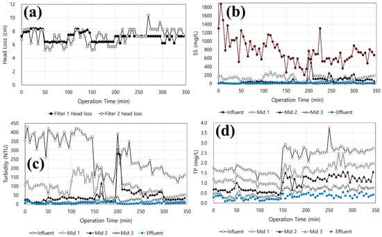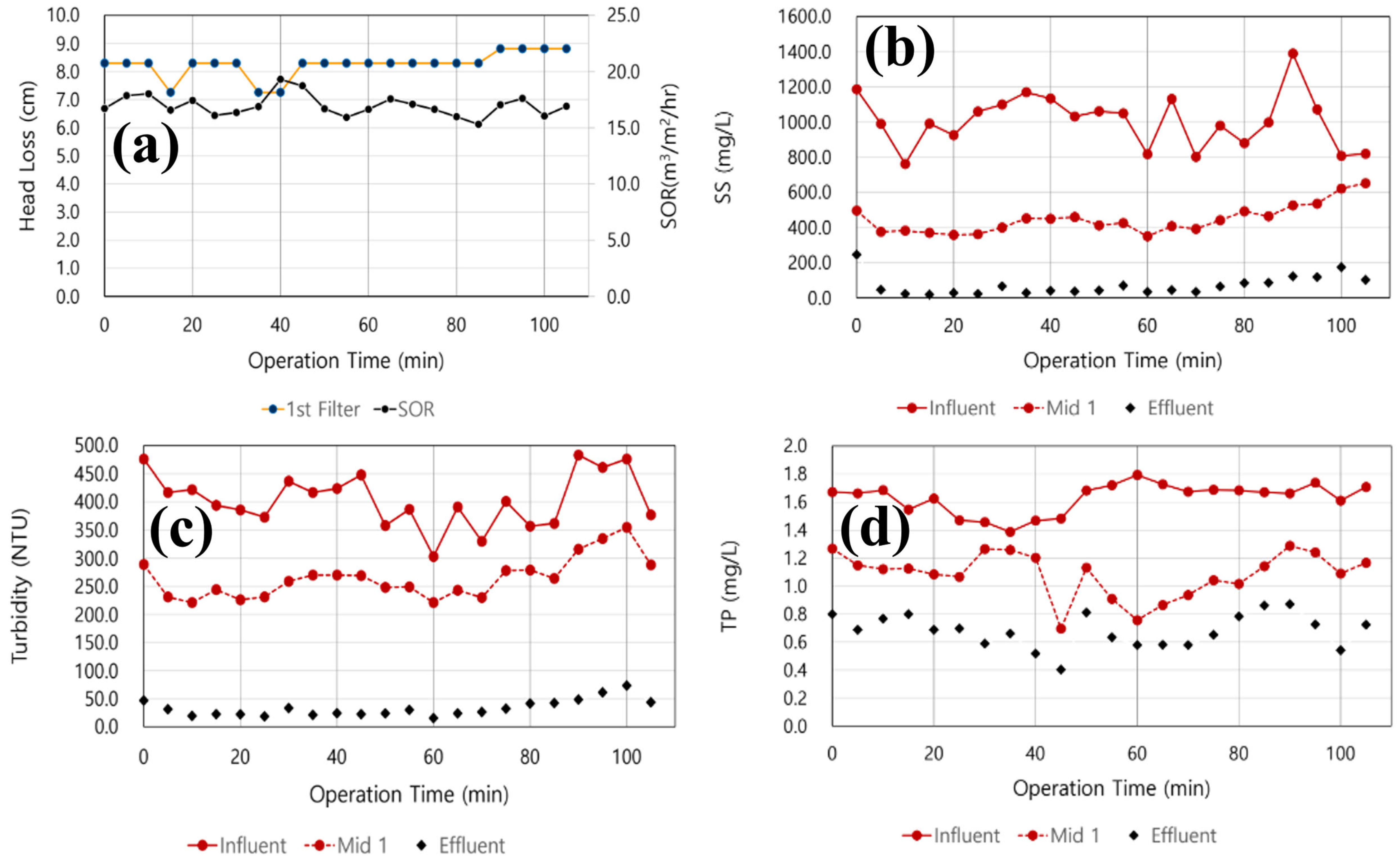 The system was operated under variable hydraulic loading, with surface overflow rates adjusted between 15 and 27 m3·m−2·h−1 by controlling pump speed, and coagulant (PACS) doses in the range of 5–30 mg/L were applied based on jar test results. Each run continued until effluent turbidity indicated breakthrough or the terminal head loss approached 10 cm, with operation times ranging from less than 20 min to several hours, depending on the influent quality. Grab samples were collected at regular intervals of 5–10 min from the influent, mid-column ports, and final effluent to assess stage-specific removal of turbidity, SS, and TP.