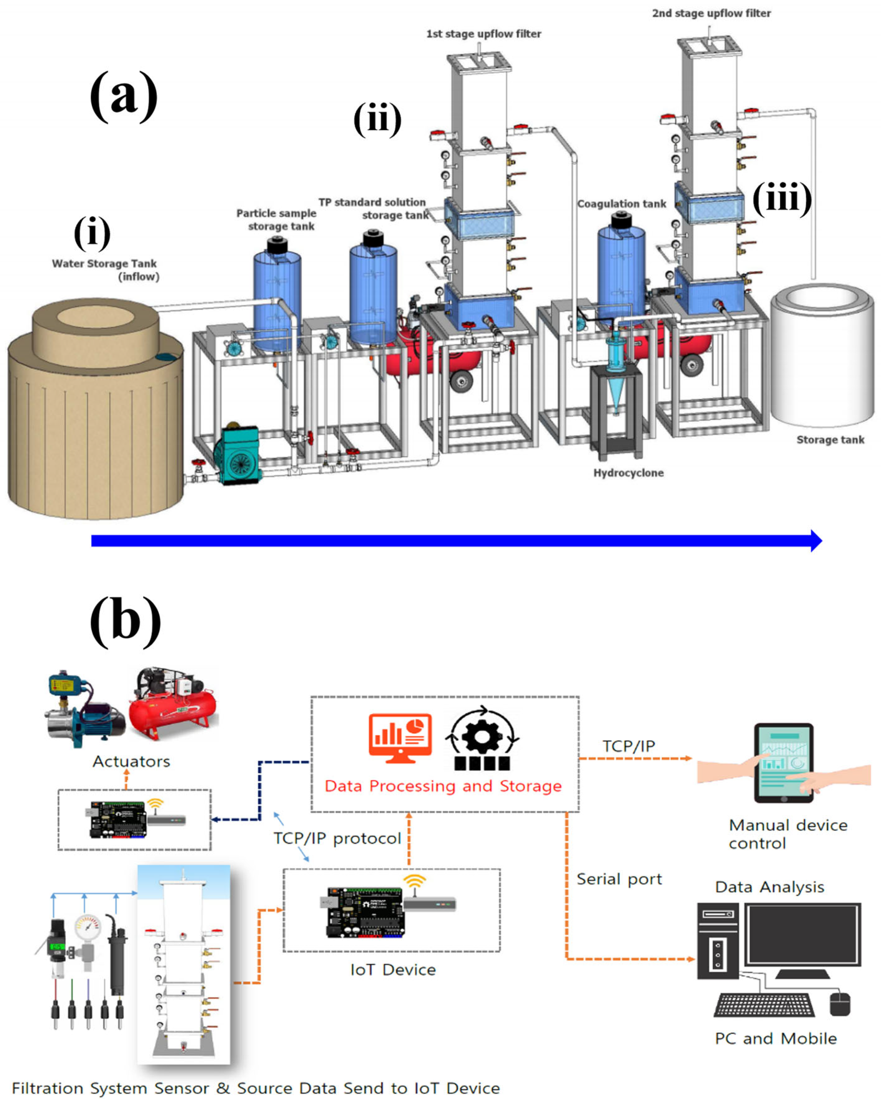 Schematic diagram of (a) the laboratory-scale two-stage up-flow filtration system developed in this study. The system consists of: (i) influent preparation and dosing unit, including the water storage tank, particle sample storage tank, TP standard solution tank, and dosing pumps for controlling influent concentrations; (ii) dual-stage up-flow filtration unit, comprising the two modular acrylic filter columns, coagulant mixing tank, and hydro cyclone for rapid separation of coagulated solids; and (iii) backwash and effluent handling unit, including the backwash air system, storage tank, and drainage lines. (b) IoT-based monitoring and control architecture for the filtration system.