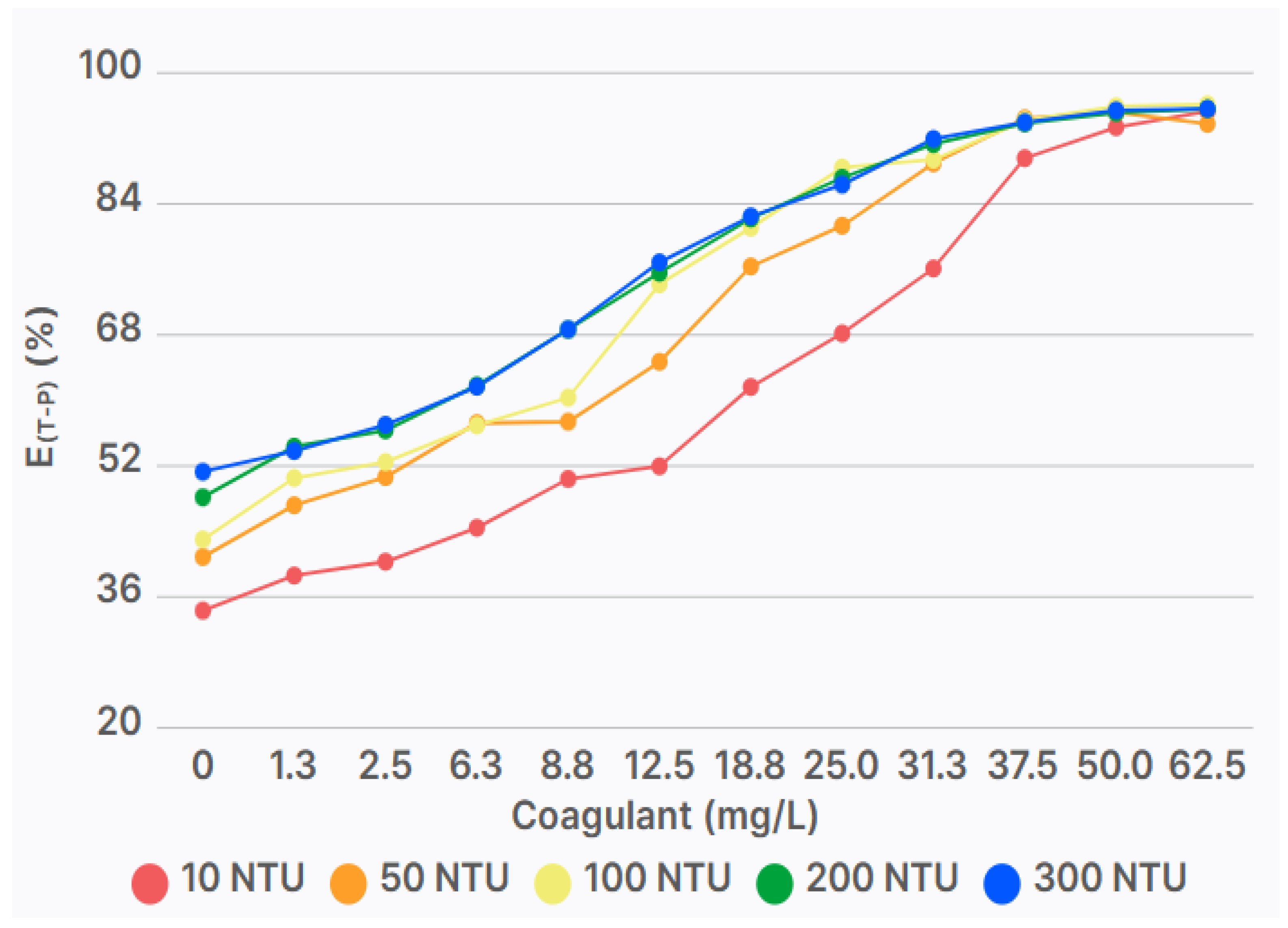 The effect of PACS dosage on phosphorus and turbidity removal was systematically evaluated under a wide range of influent turbidity conditions, representative of stormwater first flush events. Phosphorus removal efficiency increased steadily with increasing coagulant concentration for all turbidity levels. Still, the degree of response was highly dependent on the initial particle concentration (Figure 2). At the lowest turbidity tested (10 NTU), phosphorus removal efficiency was limited to approximately 85% even at the highest PACS dose of 62.5 mg/L, reflecting the inherent difficulty of treating low-solids runoff where dissolved phosphorus dominates. In contrast, at moderate turbidity levels (50–100 NTU), TP removal exceeded 70% once PACS dosage surpassed ~25 mg/L, and continued to increase to nearly 90% at higher doses. Under high turbidity conditions (200–300 NTU), removal efficiencies were dramatically higher; more than 80% of phosphorus was removed with only 12.5 mg/L PACS, and near-complete removal (~95–100%) was observed at dosages of 25–30 mg/L. These results highlight the strong interaction between particulate matter concentration and coagulation efficiency, since abundant particles provide additional surfaces for phosphorus adsorption and promote the formation of stable flocs.