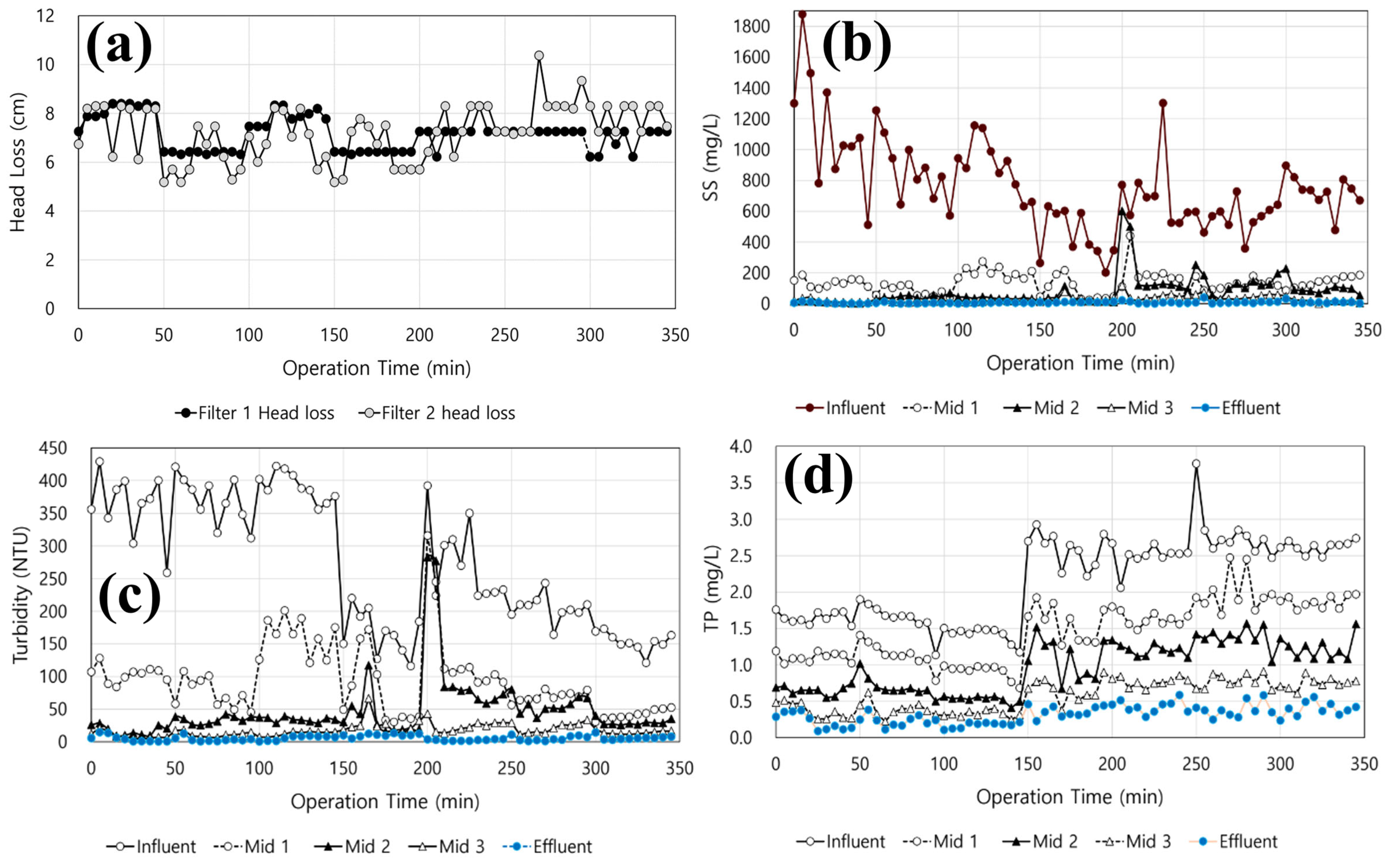 In this study, the first-flush condition was reproduced by artificially increasing the concentrations of fine suspended solids and TP in the influent rather than simulating a specific rainfall hydrograph. This approach was intended to emulate the characteristic pollutant surge observed during the initial phase of stormwater runoff. Only TP was measured, and fractionation into particulate phosphorus (PP) and dissolved phosphorus (DP) was not conducted. The discussion of PP and DP was intended to provide conceptual context for interpreting the observed turbidity–TP relationships. Future studies will incorporate PP/DP fractionation to evaluate how coagulation and filtration affect individual phosphorus species more directly.