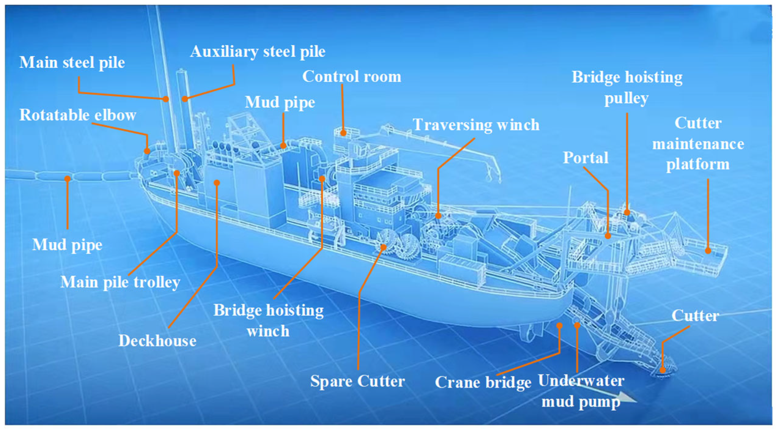 Figure 2. The excavated mixture is then transported by the mud pump through the mud pipeline. While these operational steps describe the working mechanism of the dredger, only the physical quantities directly affecting excavation and pipeline transport, such as cutter motion, pump-induced flow, and mud density, are relevant to the modeling efforts of this study.