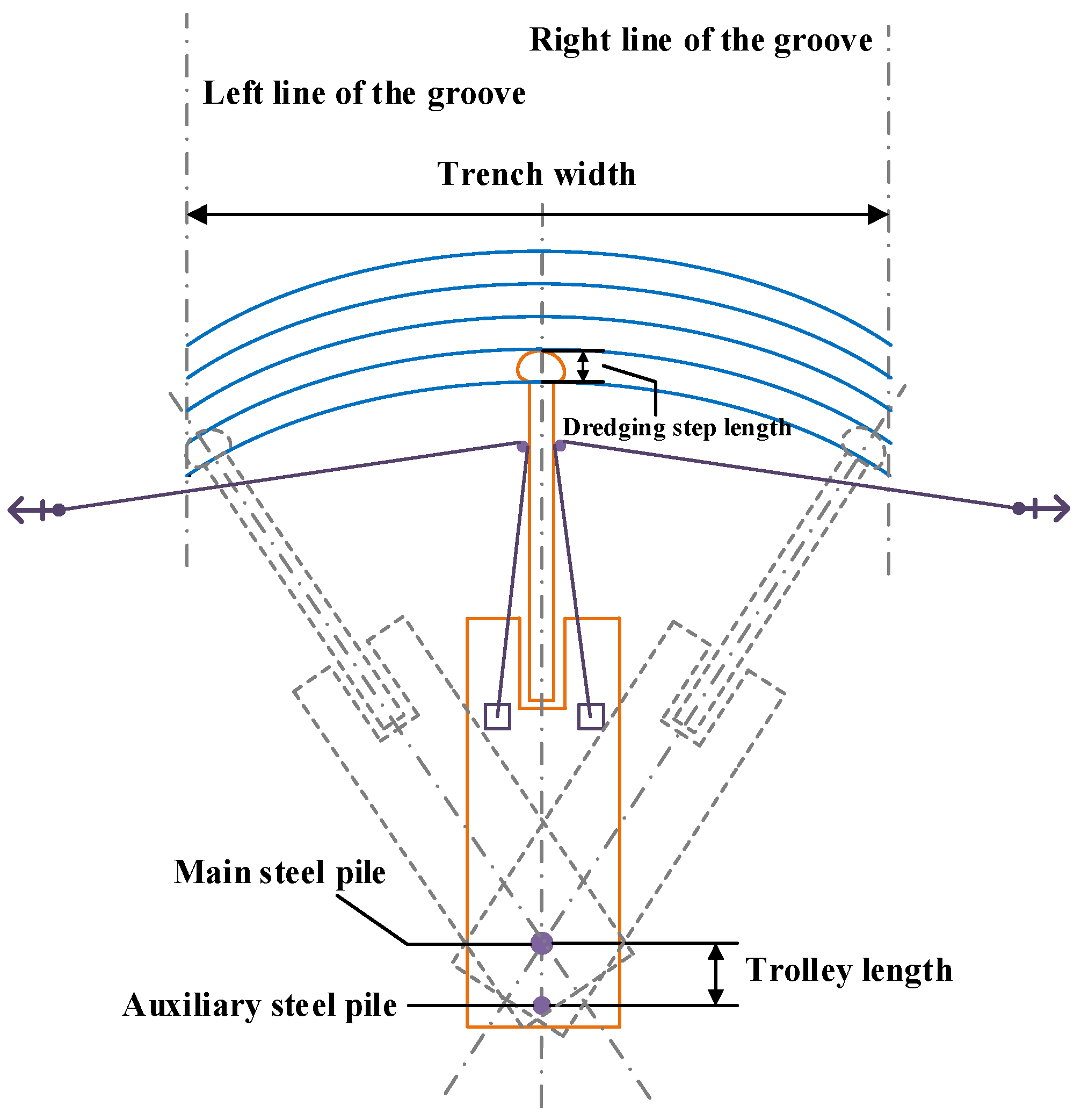 Section 2.1, the soil layer is cut mainly by the lateral swing of the cutter in the left and right directions. After completing a cycle of lateral swinging, the cutter will advance a step with the assistance of steel piles to excavate the soil ahead of it or increase the cutter depth to excavate deeper soil, as shown in