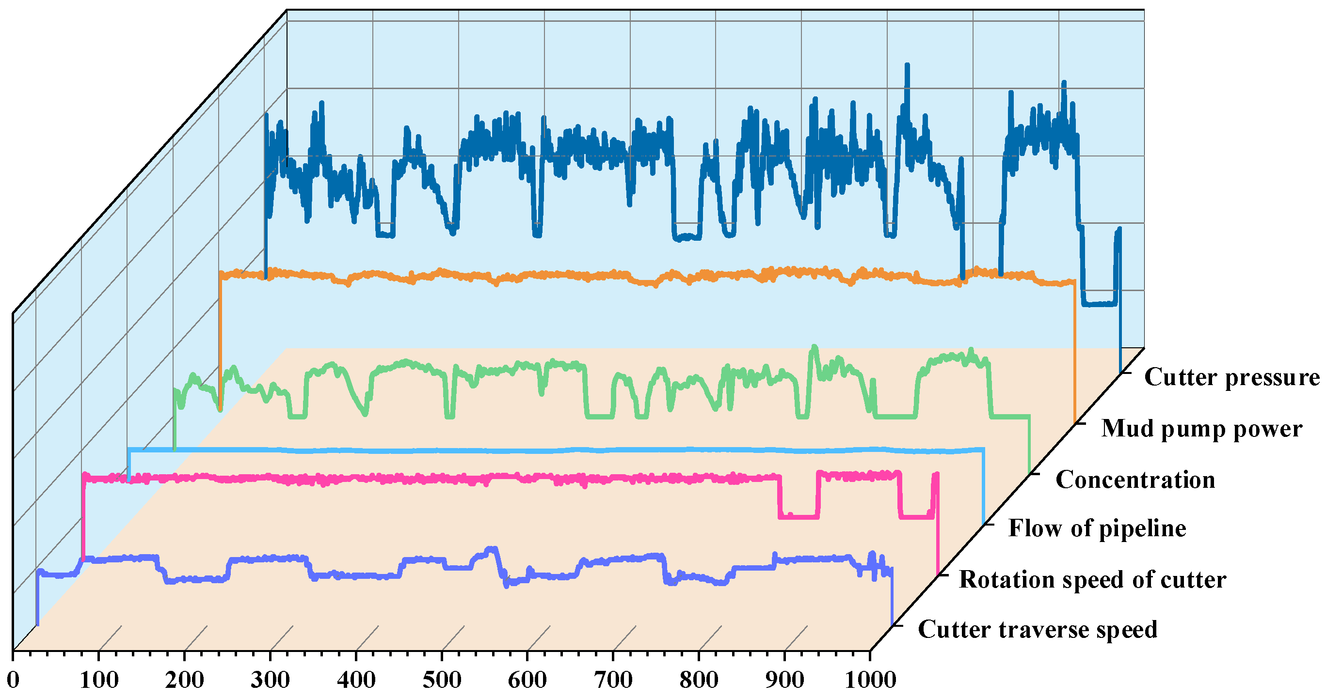 Figure 3 shows some construction monitoring data from a CSD. It can be seen from the figure that all the data fluctuate over the construction process, but the amplitude of the different parameters varies from each other. Some parameters have a slight fluctuation range, such as the “mud pump power”, while others have an extensive fluctuation range, and some parameters even have abnormal peaks or zero values for a while, which are caused by uncertain factors such as complex construction environments and unstable monitoring instruments. Take “working pressure of cutter” and “concentration” as examples. If hard rock is suddenly encountered during excavation, the rotation resistance of the cutter will increase, which will lead to a sudden increase in reamer pressure and a decrease in mud concentration. To some extent, the monitoring data reflects the current construction status of a dredger. Fully analyzing the physical meaning behind the data is helpful to adjust the construction parameters in a timely manner and achieve the management optimization of the construction process.