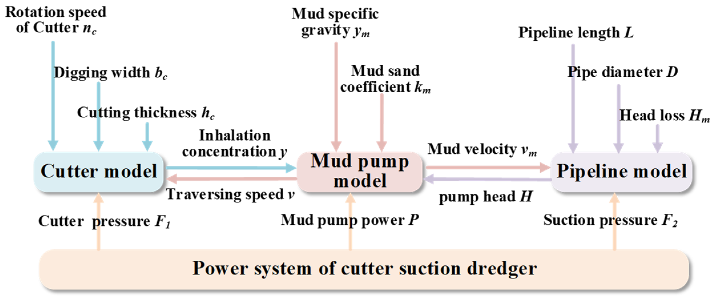 As an integrated system, the dredger’s regular operation requires the cooperation of various systems. In the excavation and transportation of mud, the cutter, mud pump, and pipeline models are the key concerns. The relationship between these sub-model parameters is shown in