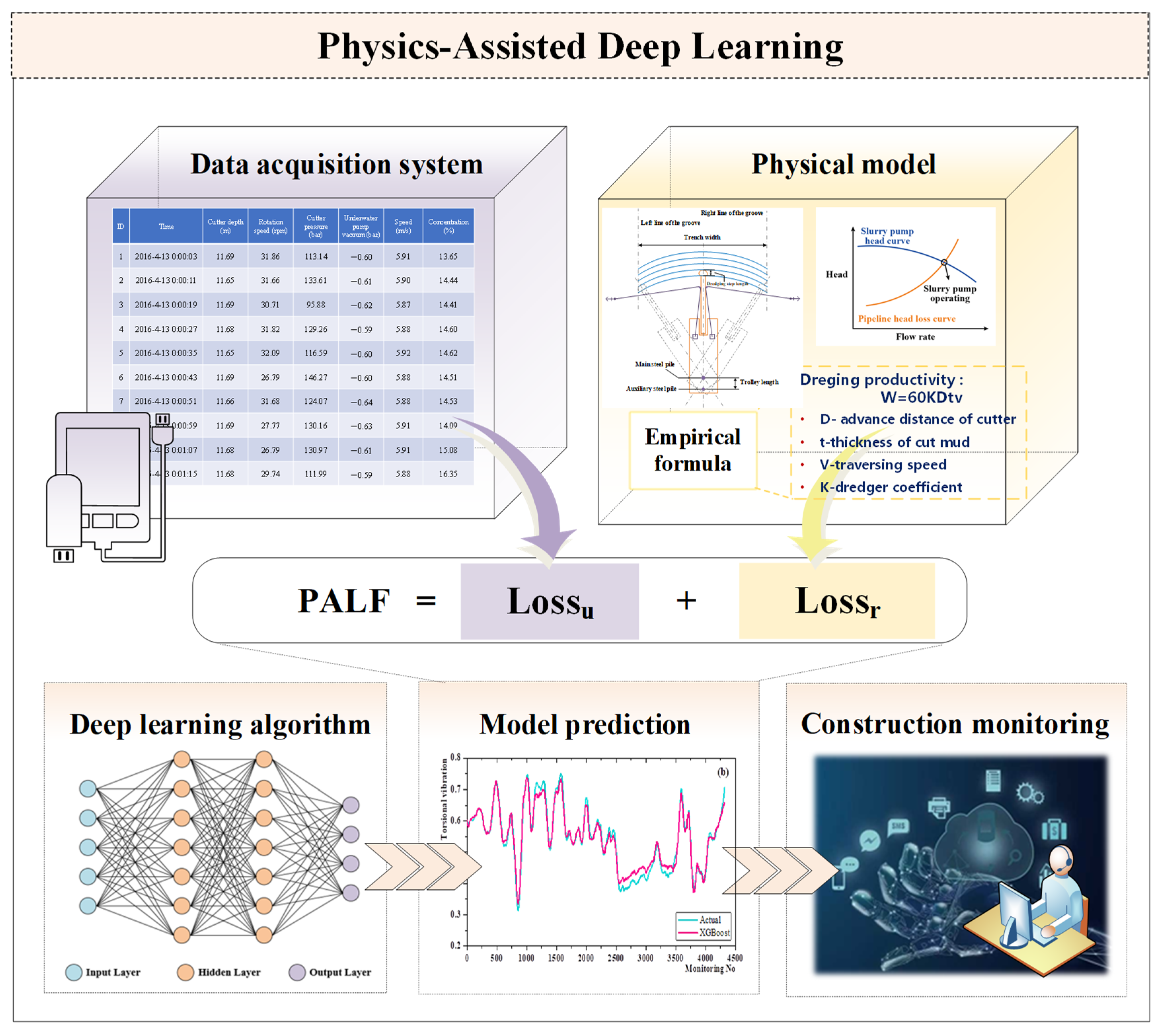 To address these limitations, this study introduces a physics-assisted loss function (PALF) that integrates both data-driven errors and physical model constraints into the training of deep learning algorithms. Unlike earlier virtual-sensor approaches or general machine-learning models that rely solely on observed data, the proposed PALF explicitly incorporates the productivity-related physical formulas of CSDs into the loss function, guiding the model toward physically consistent predictions. This integration enhances robustness under noisy or incomplete sensor data and significantly improves performance in small-sample scenarios. The resulting physics-assisted deep learning (PADL) models therefore offer a more reliable and physically interpretable framework for real-time construction monitoring of cutter suction dredgers. The rest of the paper is organized as follows: