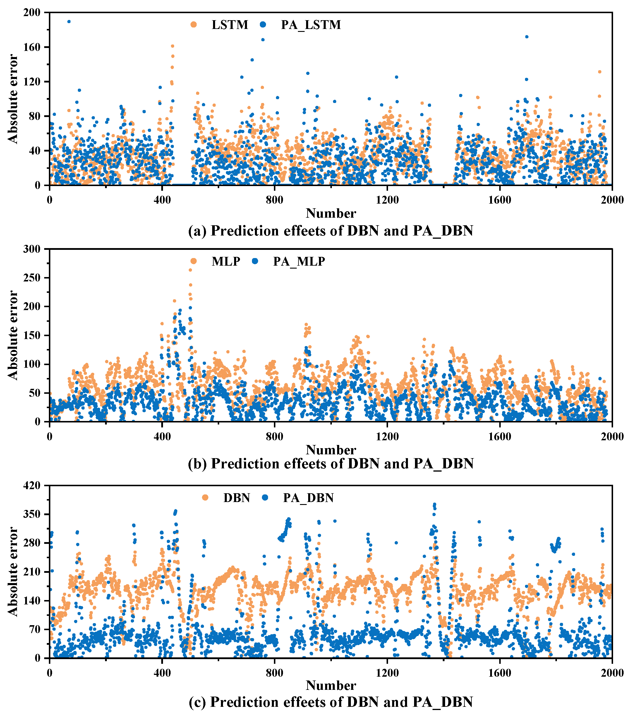 Figure 10 reports pointwise absolute errors on the test set. For each backbone (LSTM, MLP, DBN), the PALF-based variant (PA_LSTM, PA_MLP, PA_DBN) achieves lower errors than its MAE-based counterpart, indicating superior predictive performance. Among the three backbones, the LSTM family attains the smallest errors and the DBN family the largest. Quantitatively, the MAE is reduced from 32.22 to 25.67 for the LSTM models, from 62.36 to 36.81 for the MLP models, and from 199.54 to 91.12 for the DBN models, corresponding to improvements of 20.33%, 40.97%, and 54.33%, respectively.