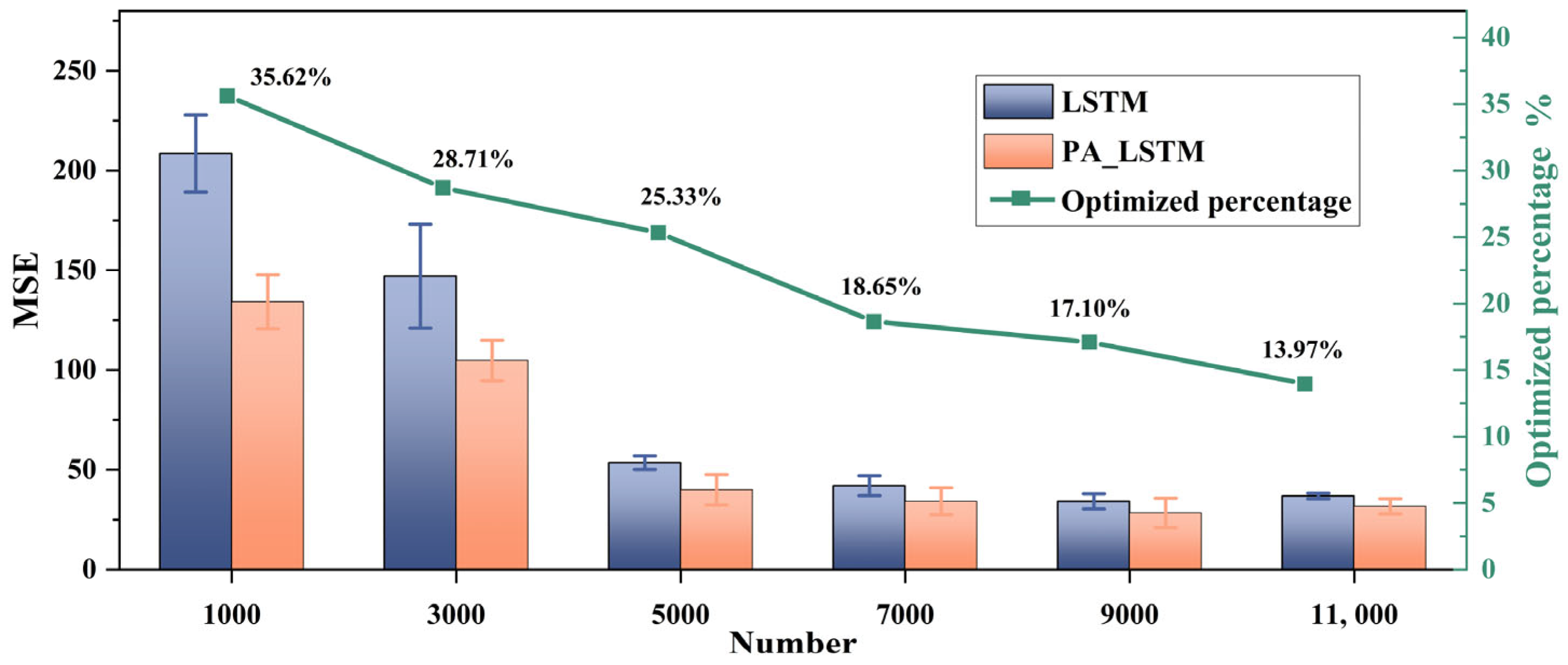 Figure 12 evaluates data efficiency by comparing LSTM and PA_LSTM across training-set sizes from 1000 to 11,000 samples. The bars (left axis) report test-set MSE, and the line (right axis) shows the relative improvement of PA_LSTM over LSTM. PA_LSTM consistently reduces errors at all sizes, with improvements of 35.62%, 28.71%, 25.33%, 18.65%, 17.10%, and 13.97% as the training size increases from 1000 to 11,000, indicating the largest gains in the small-data regime.