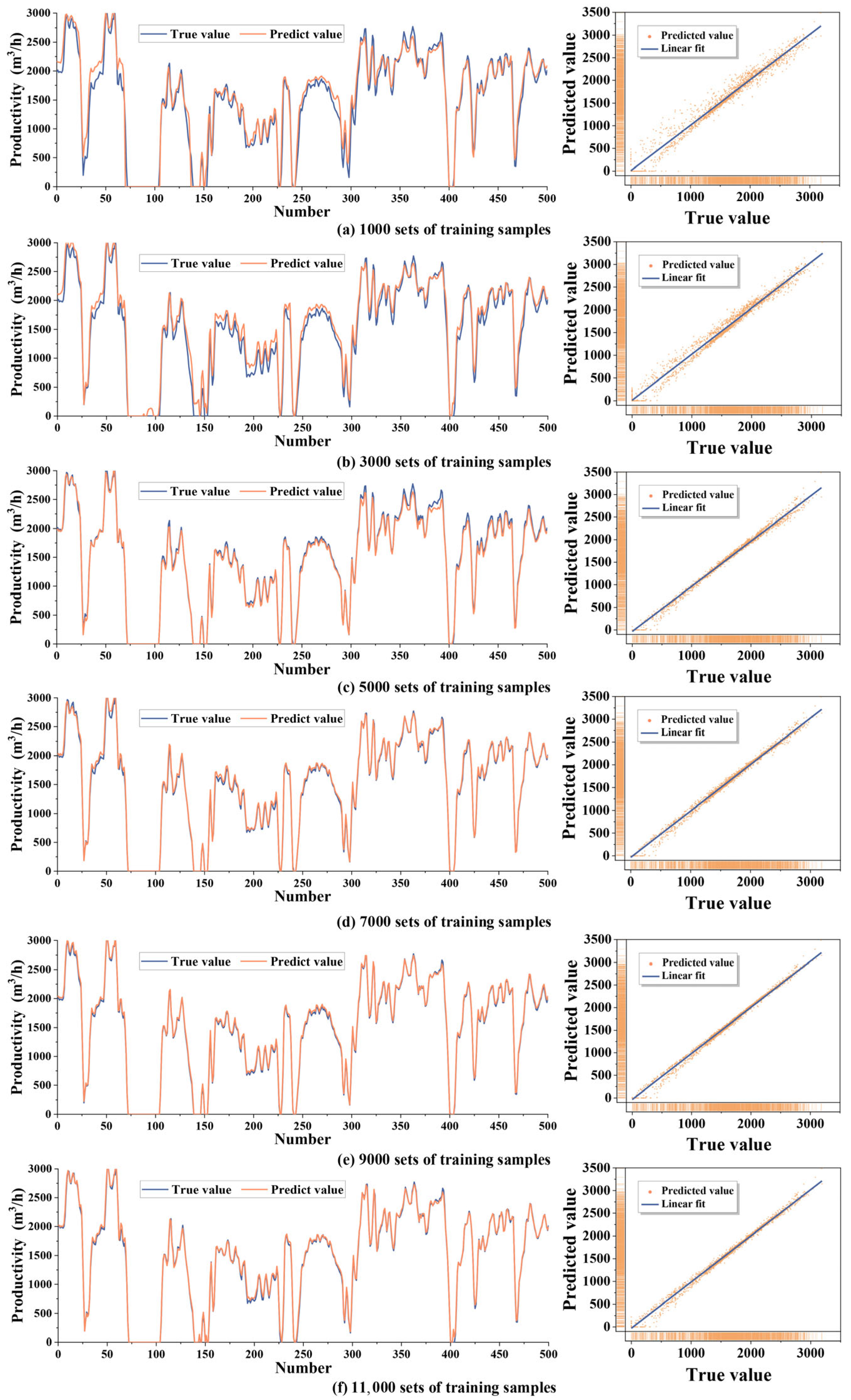 (4) By using training sets with different data samples from 1000 to 11,000 groups, the prediction effect of PA_LSTM under different data samples is studied. The results show that with the decrease in the training data sizes, the optimization effect of the PADL is more obvious. Even with a small amount of training data of 1000 groups, the model still performed well, with R2 above 0.94, verifying the advantages of PALF in a smaller data set in model training.