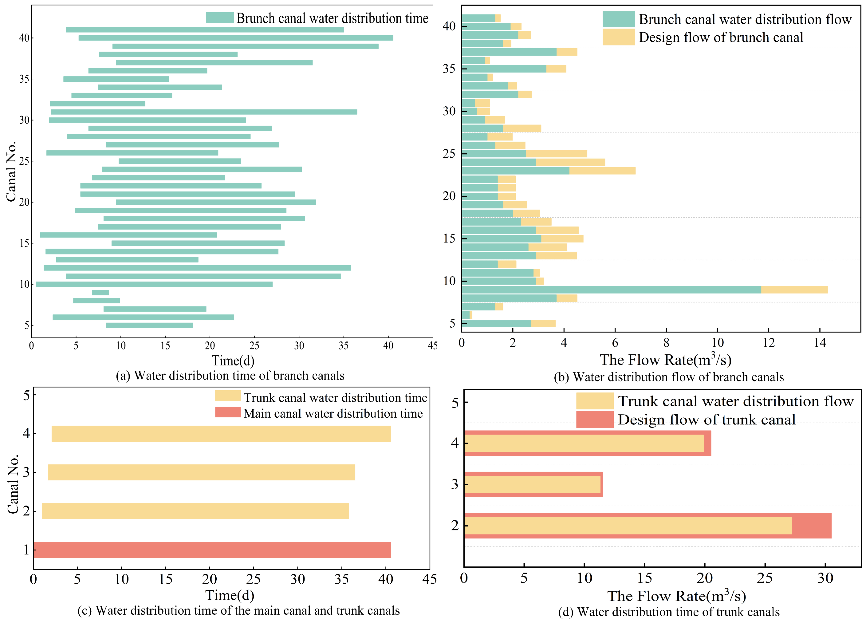 - Water balance constraint: The product of distribution flow rate and duration must equal the channel’s water demand.where W indicates the water demand (m3/s), and Δtn represents the distribution duration (s).