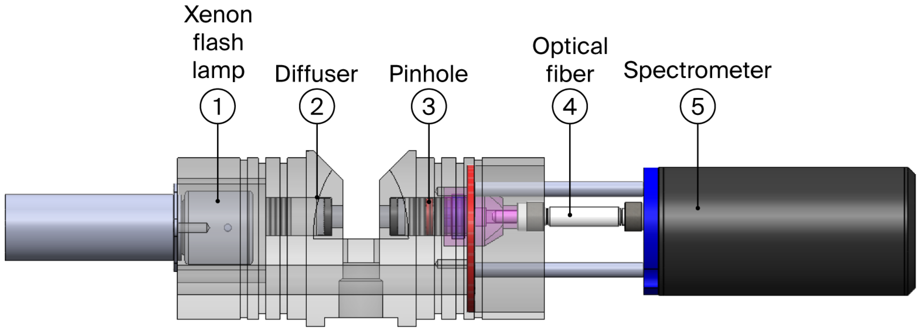 To achieve relatively uniform distribution of light intensity emitted from the light source, the light propagation direction was changed to become similar to parallel light, and unnecessary external light was reduced. Then, a diffuser (DF) and a pinhole (PH) were placed in front of the light source and optical fiber, respectively. Although the Beer–Lambert law theoretically requires monochromatic light and the absence of stray light, practical in situ sensors often utilize broadband light sources (e.g., Xenon flash lamps) and array detectors to achieve real-time monitoring. This approach is widely adopted in both academic research and industrial applications [