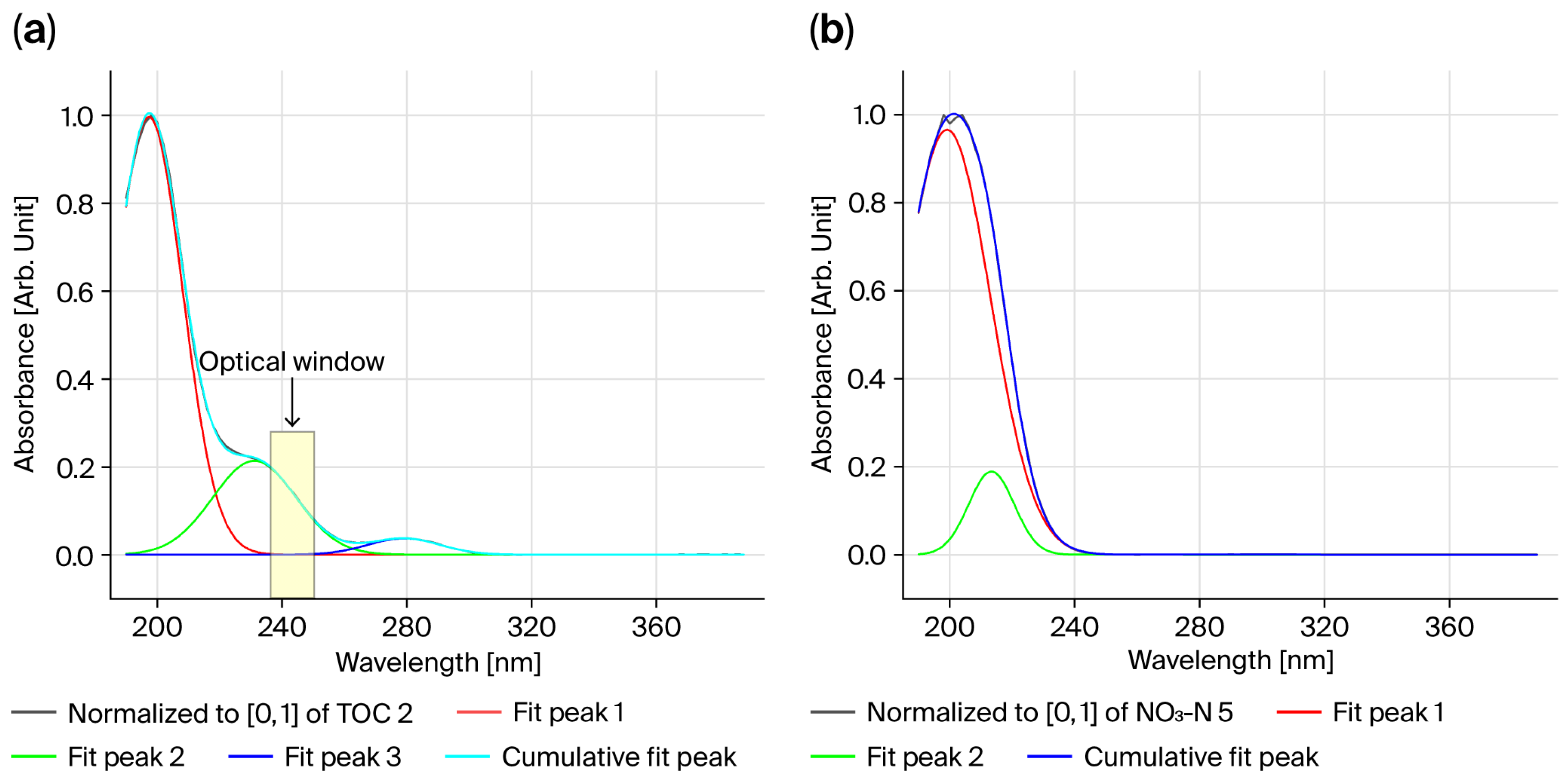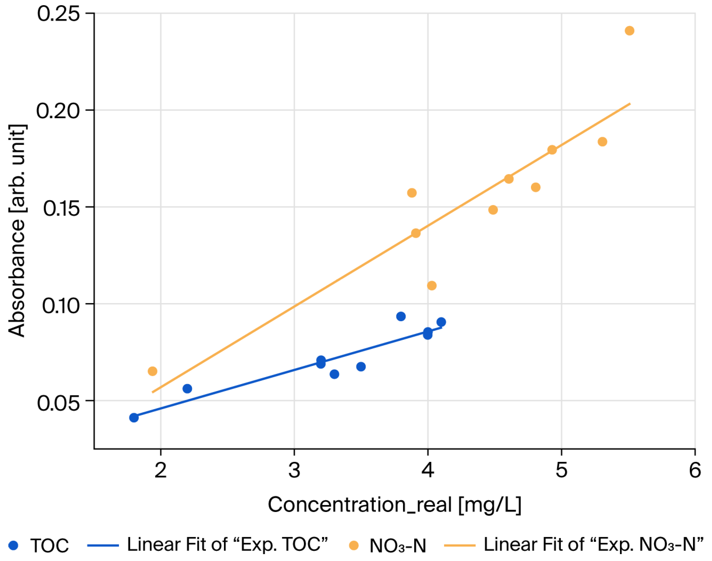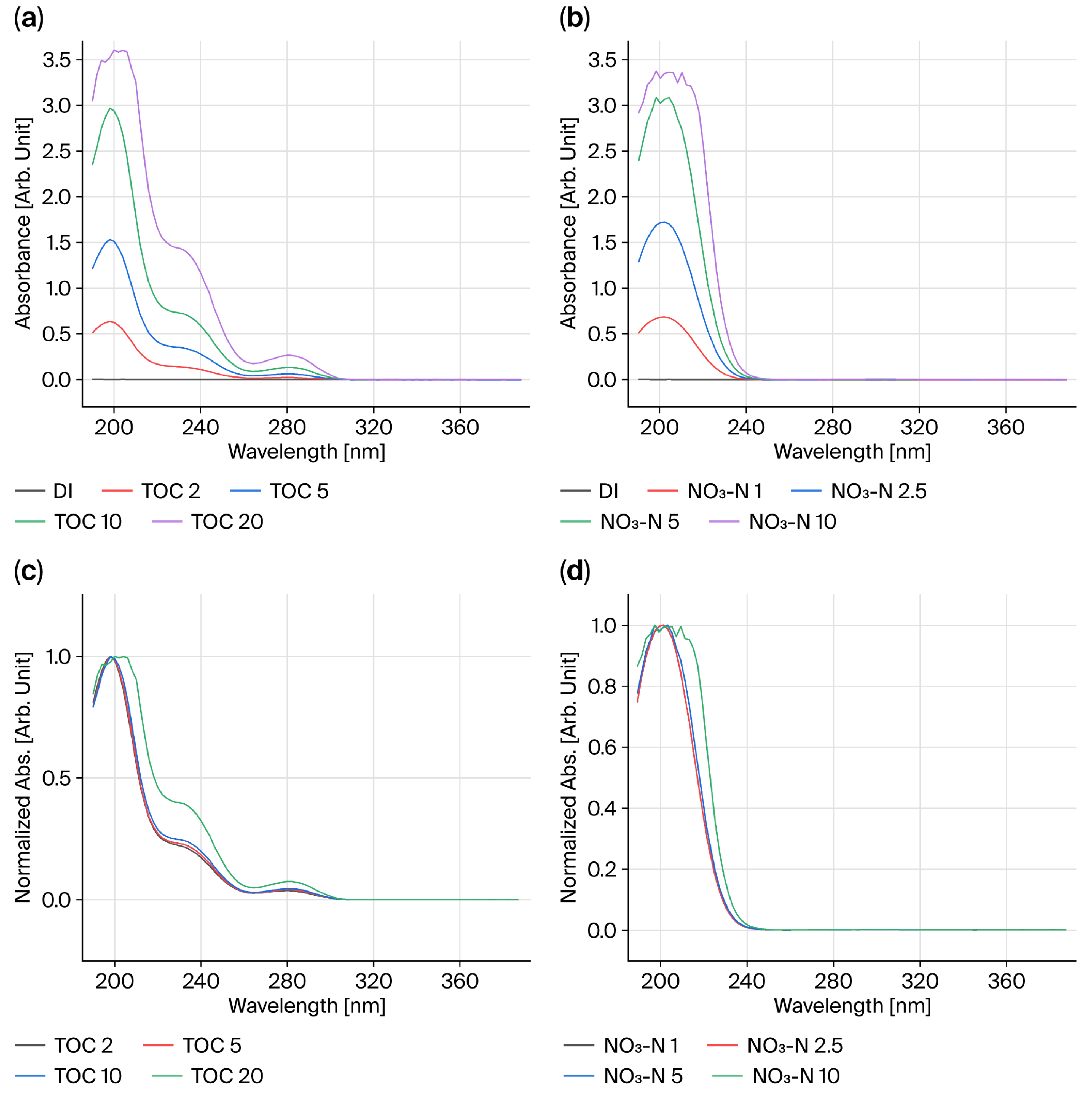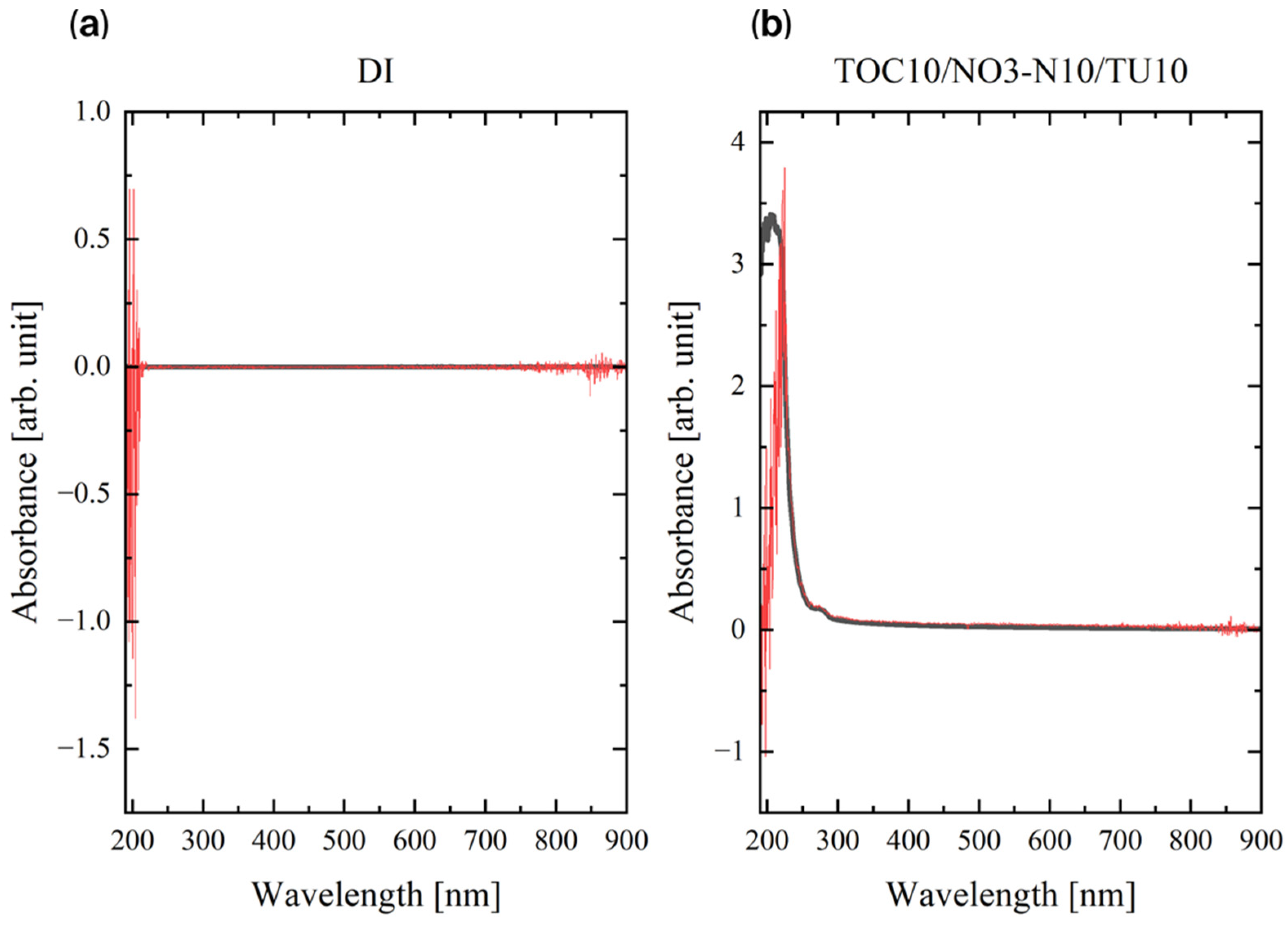 For the analysis of TOC and NO3-N standard samples, absorbance spectra were acquired in the wavelength range of 190–390 nm, with a scanning step size of 2 nm and an integration time of 0.1 s at each wavelength.