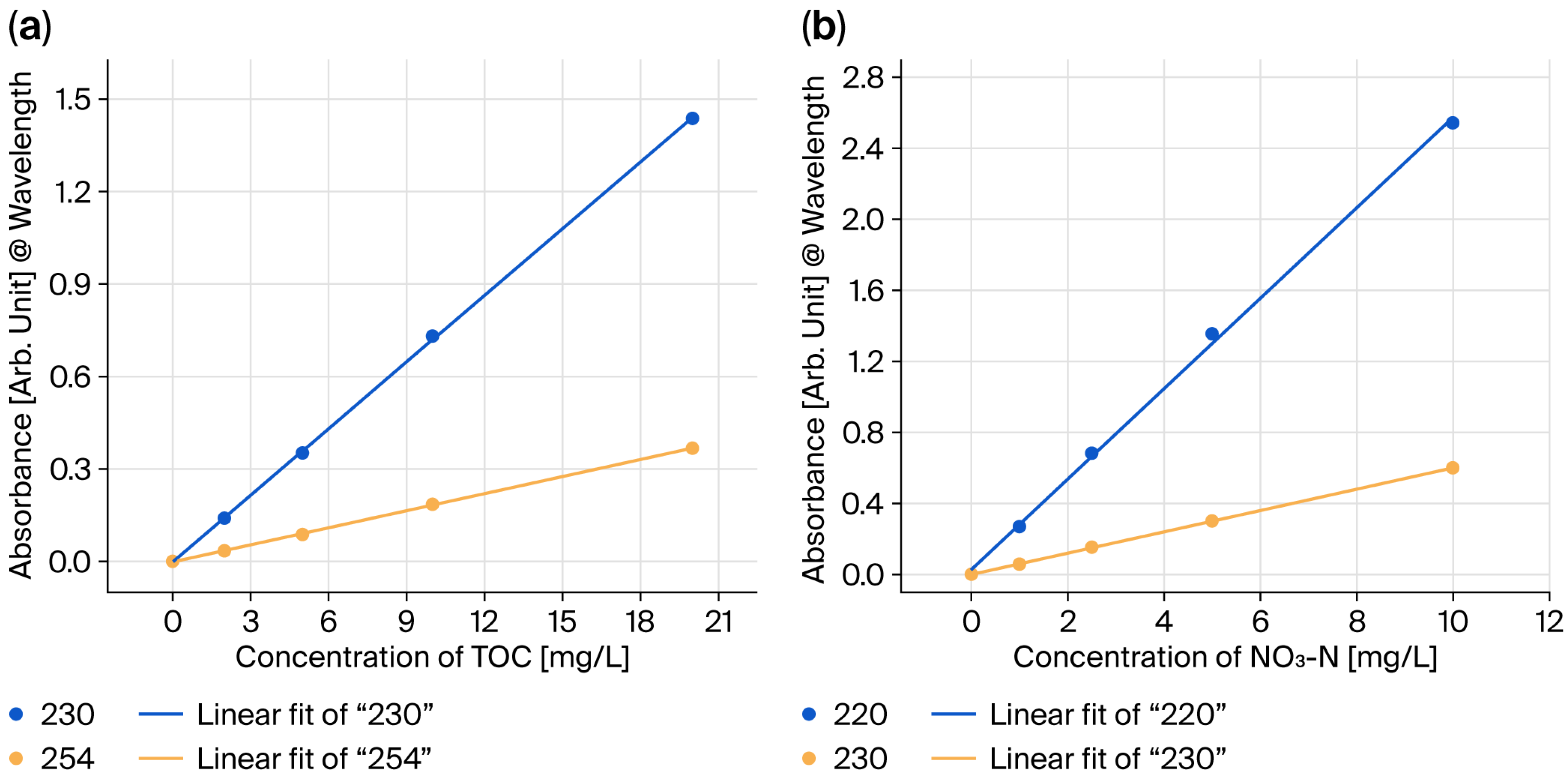 Methods of measuring total organic carbon (TOC) and nitrate (NO3-N) using UV absorbance were developed, utilizing both a commercial Agilent Cary 60 UV-Vis spectrophotometer (Agilent Technologies, Santa Clara, CA, USA) and a prototype HASM-4000 manufactured by HSKorea Co., Ltd. Absorbance (or optical density), representing the degree of light absorption in measured samples, was calculated from transmission spectrum information obtained from each instrument based on the Beer–Lambert law.