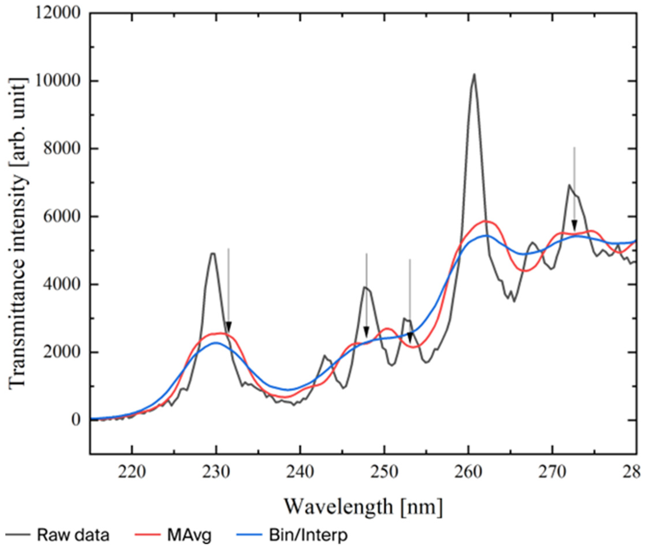 When smooth absorbance spectra cannot be confirmed in the short wavelength region by the UV absorbance method, absorbance or transmission spectra can be corrected through arithmetic methods such as Moving Average (MAvg) and Binning techniques to improve this problem.