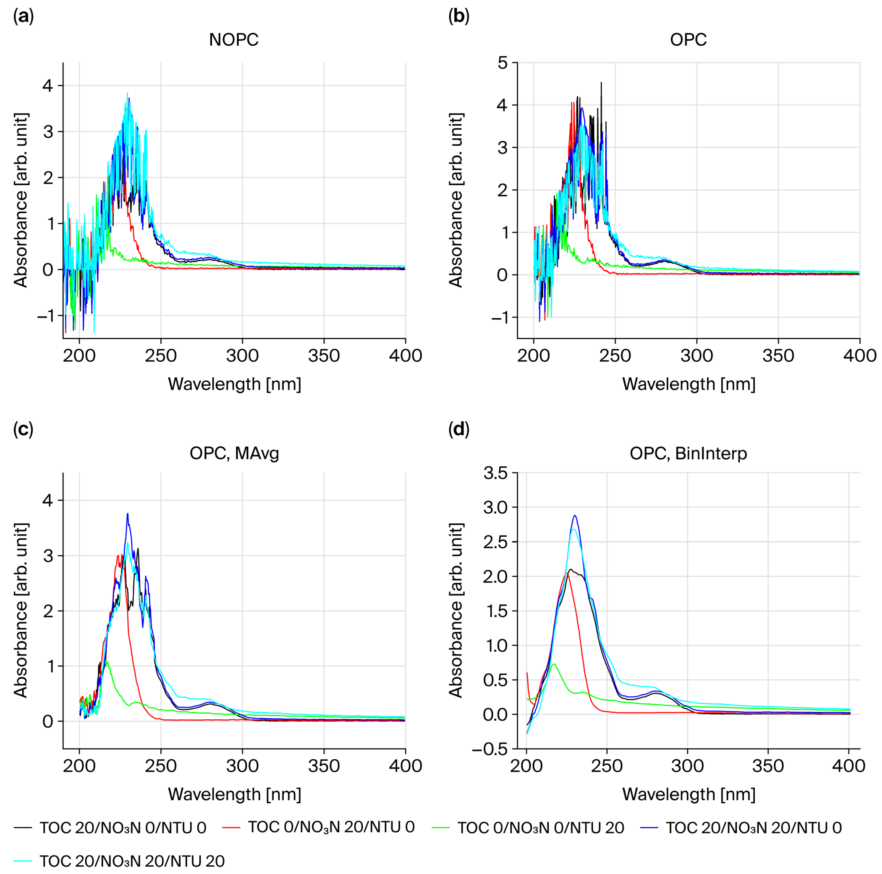 Absorbance was measured at various concentrations of total organic carbon (TOC), nitrate (NO3-N), and turbidity (NTU) using each instrument. These absorbance measurements were corrected via techniques such as optical power compensation (OPC) and Binning and Interpolation (BinInterp), and concentrations were calculated by deriving correlations.