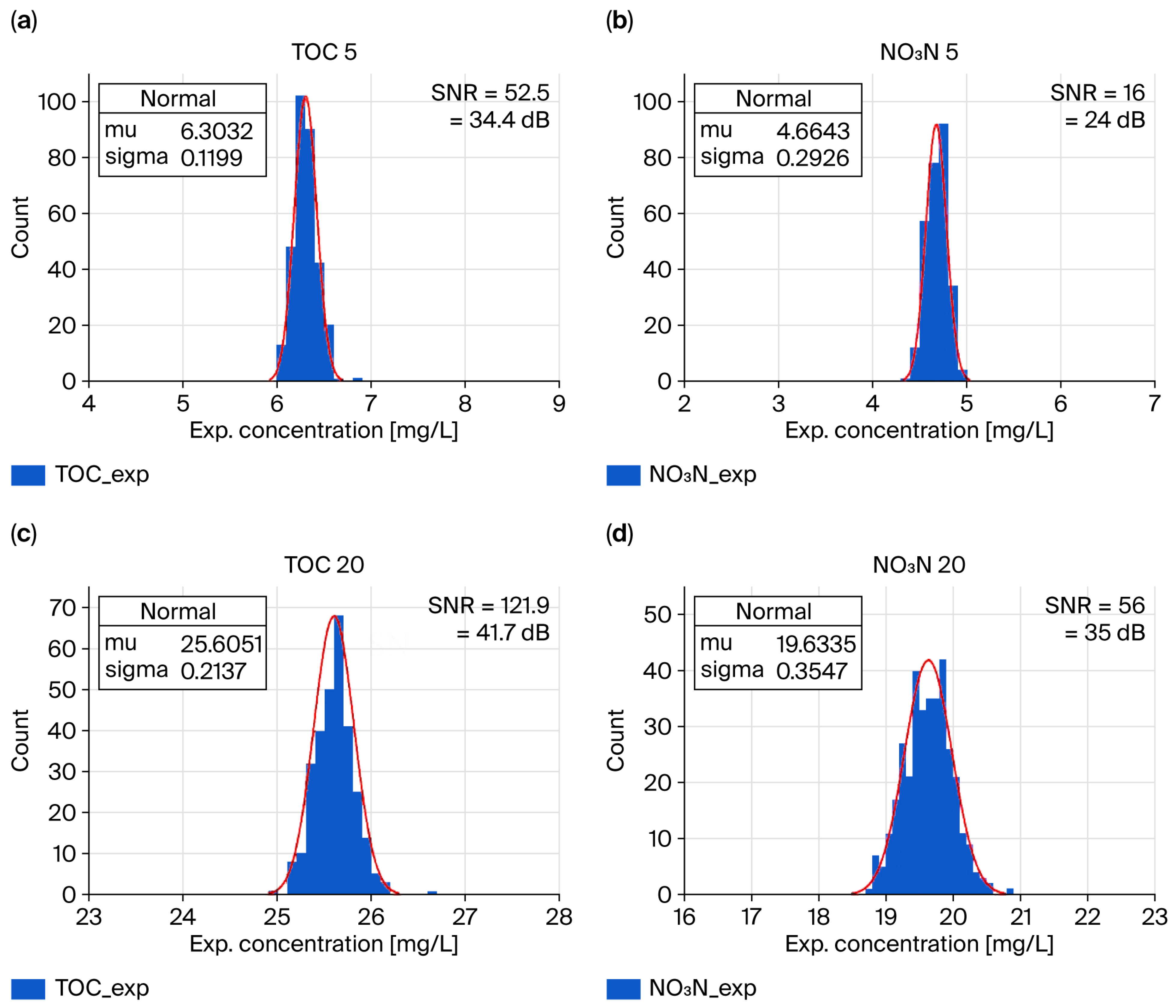 The standard materials used in this study included distilled water (DI) with TOC and NO3-N concentrations of 0 mg/L or a turbidity of 0 NTU as the blank, and pure unmixed standard materials of 5 mg/L, 10 mg/L, and 20 mg/L were prepared. For mixed TOC and NO3-N solutions excluding turbidity (TU), TOC/NO3-N/TU concentrations were mixed at 5/5/0, 10/10/0, and 20/20/0, while mixed solutions including turbidity were mixed at 5/5/5, 10/10/10, and 20/20/20.