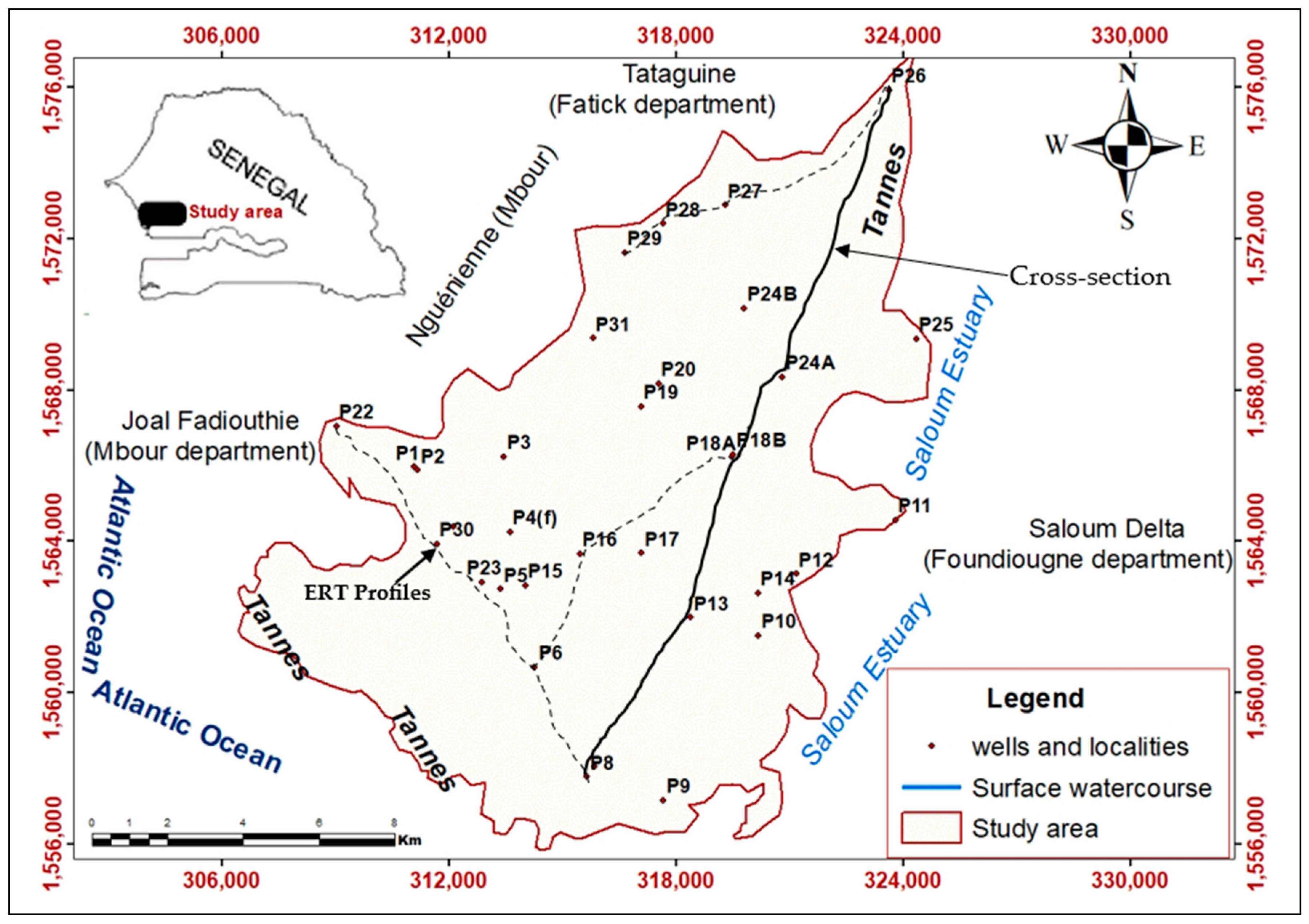 - Ndoye, S.; Fontaine, C.; Gaye, C.B.; Razack, M. Groundwater Quality and Suitability for Different Uses in the Saloum Area of Senegal. Water 2018, 10, 1837. [Google Scholar] [CrossRef]