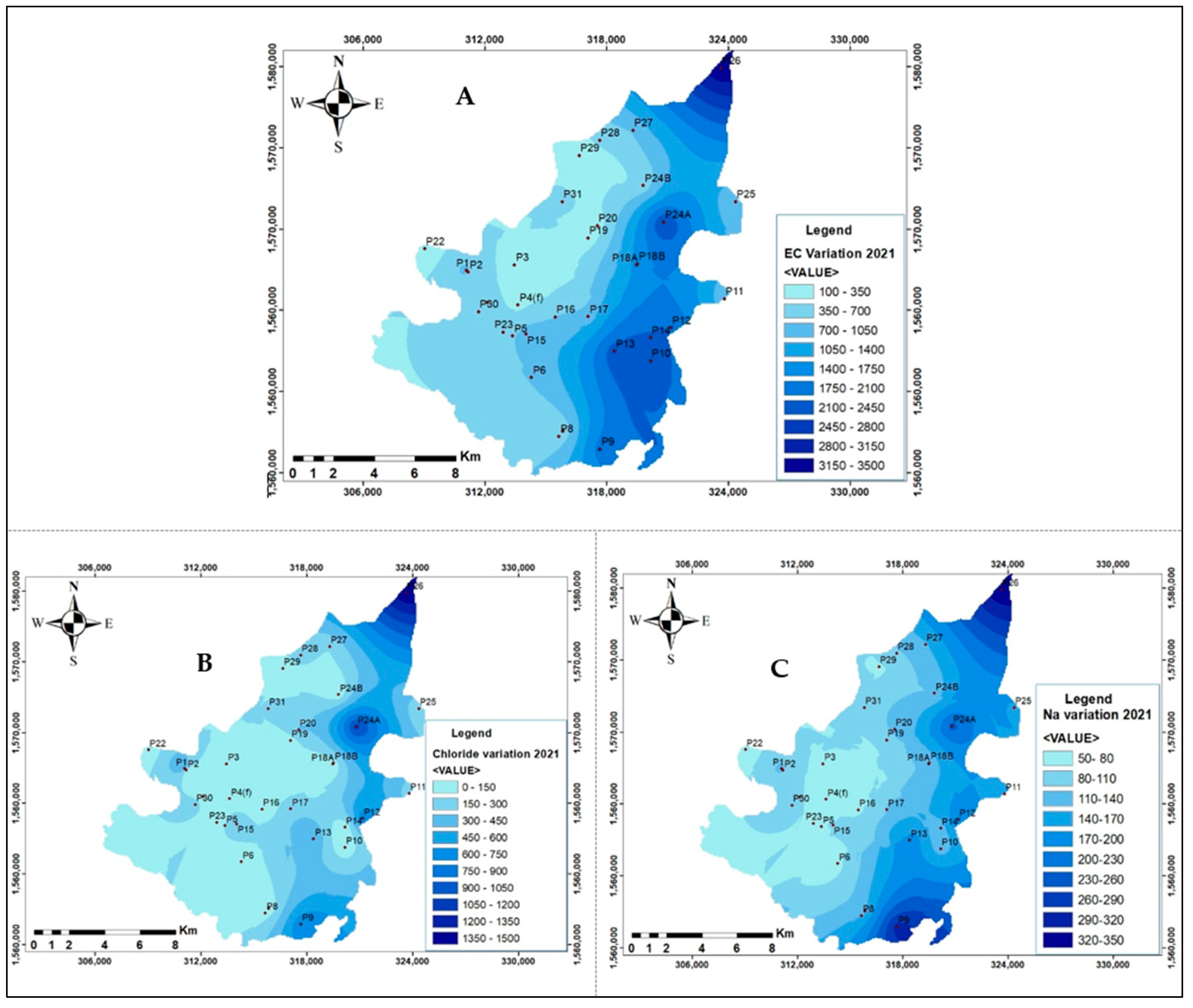 - Hydrogeochemical data, isotopic signatures, and geophysical results were integrated through spatial mapping and multivariate analyses to interpret salinization dynamics and identify dominant salinity sources.