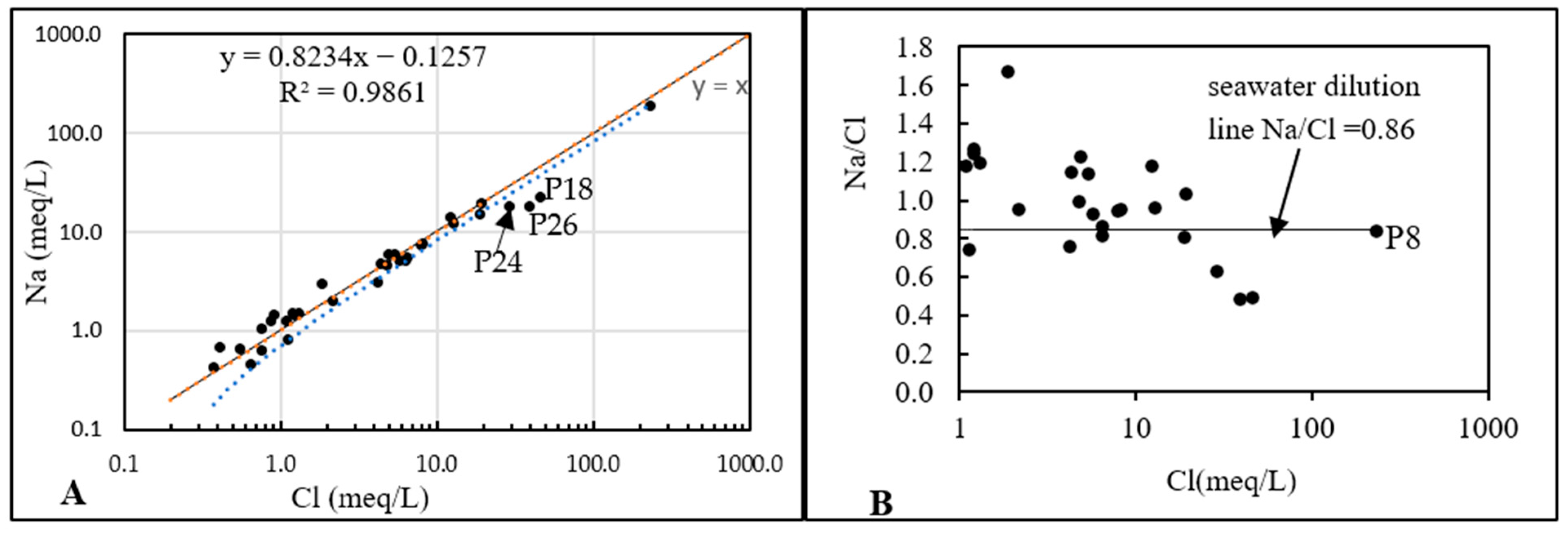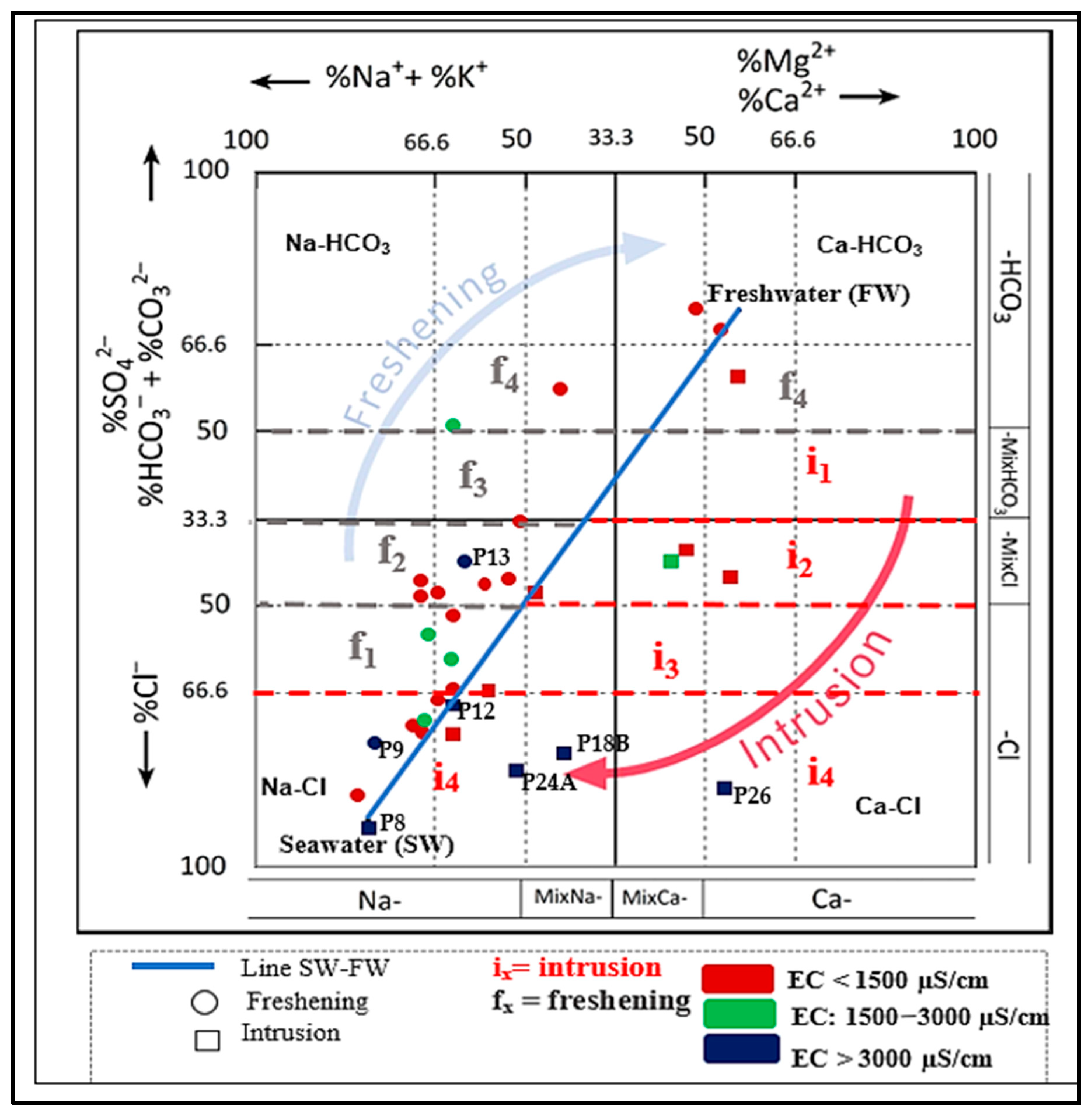- Gimenez-Forcada, E. Dynamic of sea water interface using hydrochemical facies evolution diagram. Groundwater 2010, 48, 212–216. [Google Scholar] [CrossRef]