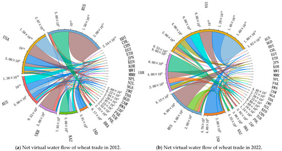 Figure 1a,b show the net virtual water flow pattern of wheat in 2012 and 2022, respectively. In terms of total net virtual water flow, overall wheat trade in 2012 showed a net virtual water outflow; RUS, the USA, AUS, UKR, and KAZ were the primary net exporters of wheat virtual water, and EGY, TUR, JPN, and CHN were the leading net importers of wheat virtual water. The total wheat trade in 2022 revealed a net inflow of virtual water, and the majority of nations imported wheat virtual water, with IND and POL being the leading net exporters, while KAZ also became a large net exporter of wheat virtual water. TUR, ZAF, BGD, and CHN were the largest net importers of wheat virtual water, with BGD changing from wheat virtual water exporter to importer.