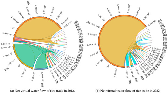 Figure 2a,b show the net virtual water flow pattern of rice in 2012 and 2022, respectively. The comparison reveals that rice showed a net virtual water outflow in 2012, while it shifted to a net virtual water inflow in 2022, with IND, the USA, RUS, and UKR as the main rice virtual water exporters in 2012 and NPL, TUR, PAK, and ZAF as the main importers of rice virtual water. In 2022, the main countries of rice virtual water exporters were IND, ZWE, MMR, and CHN, and the main countries of rice virtual water importers were BGD, TUR, ZAF, and RUS. The rice virtual water outflows of IND in 2012 and 2022 were much larger than those of other countries, especially in 2022, where its net virtual water export volume accounted for a huge proportion, indicating that IND has been one of the biggest exporters of rice virtual water for a long time. The USA and RUS changed from being virtual water exporters to importers, and ZWE changed from being a virtual water importer to an exporter. CHN and UKR remained virtual water outflow countries, but the virtual water outflows in 2022 were much lower than those in 2012, by 6.37 × 107 m3 and 2.83 × 103 m3, respectively, which may be due to the fact that CHN has been actively promoting the modernization of agriculture and water resource management over the last few years and rice cultivation has been improved, which makes the country more qualified to achieve self-sufficiency. However, the climatic conditions in UKR are not conducive to large-scale rice cultivation, which may have further reduced the area used for rice cultivation by 2022, leading to a decline in virtual water outflows.