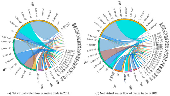 Figure 3a,b reveal net virtual water flow patterns of maize in 2012 and 2022, respectively. The net virtual water for maize trade in both 2012 and 2022 showed net inflows. The largest virtual water net exporters in both 2012 and 2022 were the USA, BRA, UKR, and IND, and the largest virtual water net imports in 2012 were JPN, KOR, CHN, and ZWE. The largest virtual water net importers in 2022 were JPN, CHN, EGY, and KOR, with JPN reaching flows of more than 1.10 × 1010 m3 in both years. NZL and THA changed from being exporters of maize virtual water to importers. Agriculture in NZL has become more focused on meat and dairy in recent years, which has caused the trade of maize to decline in favor of imports. PAK and ZAF changed from being importers to exporters of maize virtual water. This is thanks to the Government of PAK encouraging farmers to expand maize cultivation in response to grain security concerns and to fast-moving agricultural technology in ZAF, which has put it in a position to take full advantage of its vast black soil resources, making for higher maize virtual water exports.