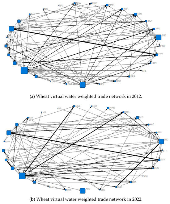 The overall trade network analysis can be carried out by constructing a trade network diagram. The wheat virtual water trade network characterization is an example. Figure 5 shows a weighted trade network graph for wheat virtual water in 2012 and 2022, where nodes indicate that the participating countries carry out wheat virtual water trade, the node size represents the centrality of each country, and the connecting line indicates the existence of a virtual water trade connection between these two countries. The direction of the connecting line points from the exporting country to the importing country, and the virtual water trade volume of wheat between the two nations is indicated by the edge’s thickness. It is intuitively clear that a reasonably close wheat virtual water trading relationship was developed by the overall network. In both 2012 and 2022, the USA, AUS, RUS, IND, and a few other countries had the most wheat virtual water trade relationships, which means that they held very important positions in the weighted trade network. There were countries that only imported wheat virtual water but did not export, such as KEN in 2012 and MMR and EGY in 2022, which had low trade volumes and low participation and were on the fringes of the network. In 2012, wheat virtual water trade between RUS exporting to EGY, UKR exporting to EGY, and the USA exporting to JPN was significant, whereas in 2022, the wheat virtual water trade between the USA exporting to KOR, the USA exporting to NGA, and IND exporting to BGD were significantly higher. This may be due to the fact that, after the introduction of the “Belt and Road” Initiative in 2013, more countries in Asia and Africa actively participated in grain trade, which facilitated trade cooperation between them and developed countries.