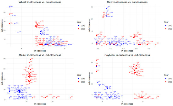 Figure 6 shows the closeness centrality of each country in the virtual water trade network for wheat, rice, maize, and soybean, respectively. In terms of the closeness centrality of virtual water trade network for wheat, UKR, RUS, THA, and KOR had a small in-closeness centrality and out-closeness centrality in 2012, and ZAF and JPN had a small in-closeness centrality and out-closeness centrality in 2022, located on the edge of the network. The USA, TUR, and IND are in the middle of the scatter plot located in the upper right section in both 2012 and 2022, indicating that these countries were wheat virtual water network center countries, while most countries are in the lower right position in both years, indicating that they participated in international trade as wheat virtual water trade exporters.