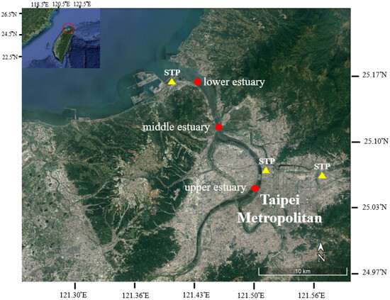 There are three sewage treatment plants (STPs) in the river estuary system (Figure 1). The Bali STP is the largest STP among the three STPs, and its daily sewage treatment ranges between 0.94–1.30 (average 1.16) × 106 m3/d in 2023. The average concentrations of chemical oxygen demand (COD), suspended particulate matter (SPM), and pH in the discharge effluent of the Bali STP were 181.32 mg/L, 55.78 mg/L, and 6.94, respectively, in 2023 [52]. The treated effluent of the Bali STP is discharged into the inshore, outside of the DRE. The DTHg concentration in adjacent seawater off the Bali STP was 9–22 ng/L and the concentration reduced to 1–2 ng/L in the ambient seawater in the seasonal investigation during the studied periods from May 2003 to January 2005 [40]. The other two STPs, located in the upper estuary, had daily sewage treatment in the range 1.62–2.17 (average 1.91) × 105 m3/d and 4.04–4.65 (average 4.41) × 105 m3/d, respectively, in 2023. The concentration ranges of chemical oxygen demand (COD), SPM, and pH in the discharge effluent of these two STPs were 31.5–43.2 mg/L, 13.3–16.2 mg/L, and 6.5–7.0, respectively, in 2023 [52]. The nutrient pollution of the DRE caused by the municipal waste waters has been addressed well in our previous studies [36,37,38].