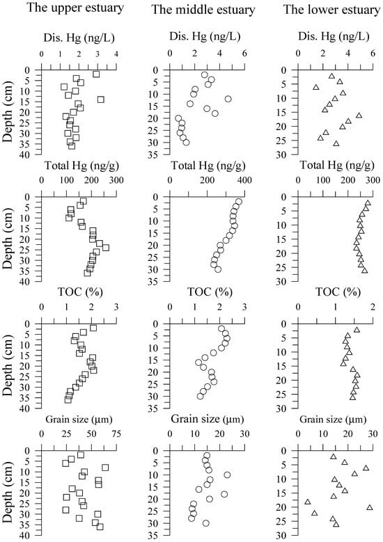 The detailed interpretations of analyzed results of pH, the redox potential (Eh), and dissolved N species in pore waters, and the GS, TOC, and TN in the three sediment cores of the DRE can be found in our recent study [39]. The present study will concentrate on the interpretation of Hg geochemical variations in the three sediment cores. The GS and TOC are often the crucial parameters which influence the content of sedimentary Hg in the marine environment [17,35,62,63,64,65]. Thus, both parameters will be briefly described in the present work. The concentration ranges of DTHg in pore water, and total Hg, TOC, GS, and the percentage of four-size GS of the three sediment cores are tabulated in Table 3, and their profiles are shown in Figure 3. The GS and TOC in the three sediment cores were in the range 3.86~63.94 μm and 1.06~2.29%, respectively. The very fine sand and mud fractions dominated the GS of sediment core of the upper estuary, while the mud fraction (<63 μm) governed the GS of the middle and lower estuary.