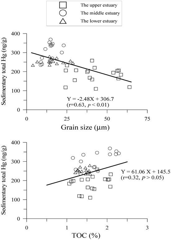 The DTHg concentrations in pore waters of the three sediment cores ranged between 0.69–4.89 ng/L, and their profiles exhibited a little scatter and varied independently with depth. The total Hg concentrations in the three sediment cores of the DRE were in the range 110–369 ng/g, and the concentrations followed the following sequence: the middle estuary > the lower estuary > the upper estuary, which may be attributed to the grain size effect. Figure 4 shows the scatter plots of the total Hg concentrations against the grain size in all the sediment core samples, and both parameters negatively correlate well, suggesting that the finer the sediment, the higher the Hg concentration. This result agreed well with some studies of the marine sediment, such as the Baltic Sea [62], the Adriatic Sea [64], and the East China Sea [35]. Meanwhile, the total Hg concentrations weakly positively correlate with the TOC in all the sediment core samples.